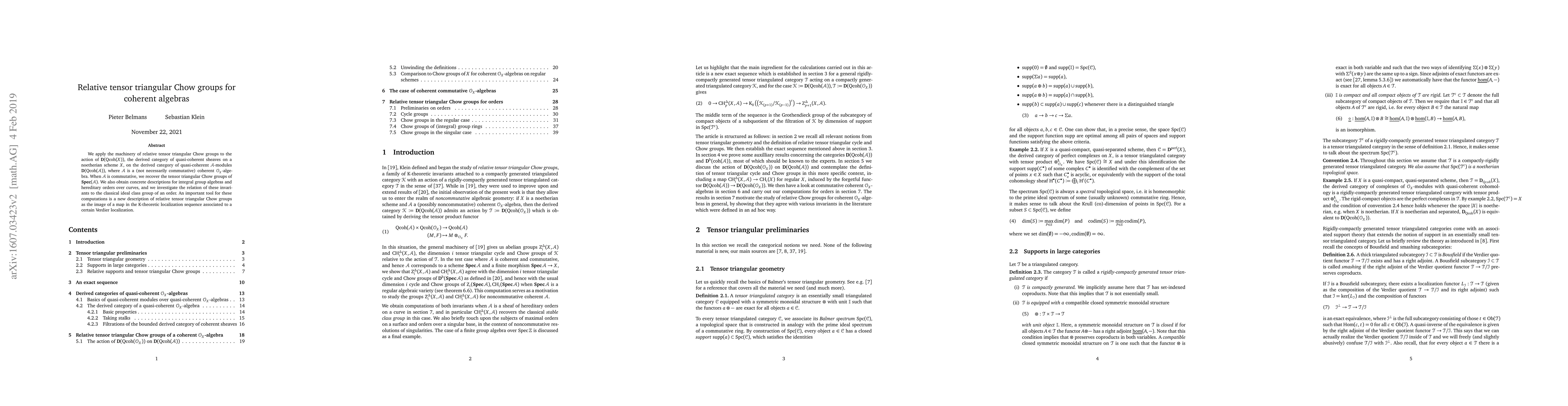 We apply the machinery of relative tensor triangular Chow groups to the action of the derived category of quasi-coherent sheaves on a noetherian scheme $X$ on the derived category of quasi-coherent $\mathcal{A}$-modules, where $\mathcal{A}$ is a (not necessarily commutative) quasi-coherent $\mathcal{O}_X$-algebra. When $\mathcal{A}$ is commutative and coherent, we recover the tensor triangular Chow groups of the relative Spec of $\mathcal{A}$. We also obtain concrete descriptions for integral group algebras and hereditary orders over curves, and we investigate the relation of these invariants to the classical ideal class group of an order. An important tool for these computations is a new description of relative tensor triangular Chow groups as the image of a map in the K-theoretic localization sequence associated to a certain Verdier localization.