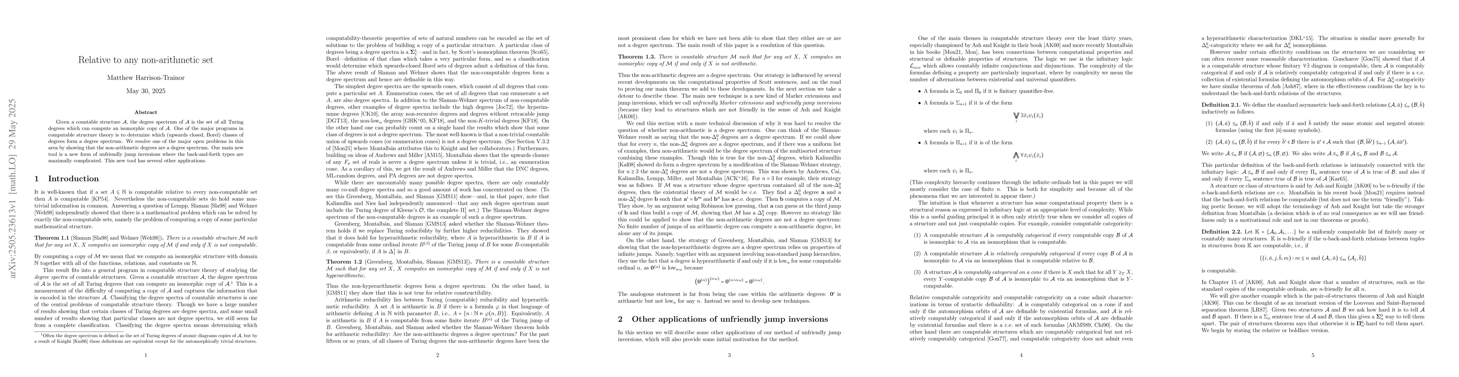 Given a countable structure $\mathcal{A}$, the degree spectrum of $\mathcal{A}$ is the set of all Turing degrees which can compute an isomorphic copy of $\mathcal{A}$. One of the major programs in computable structure theory is to determine which (upwards closed, Borel) classes of degrees form a degree spectrum. We resolve one of the major open problems in this area by showing that the non-arithmetic degrees are a degree spectrum. Our main new tool is a new form of unfriendly jump inversions where the back-and-forth types are maximally complicated. This new tool has several other applications.
