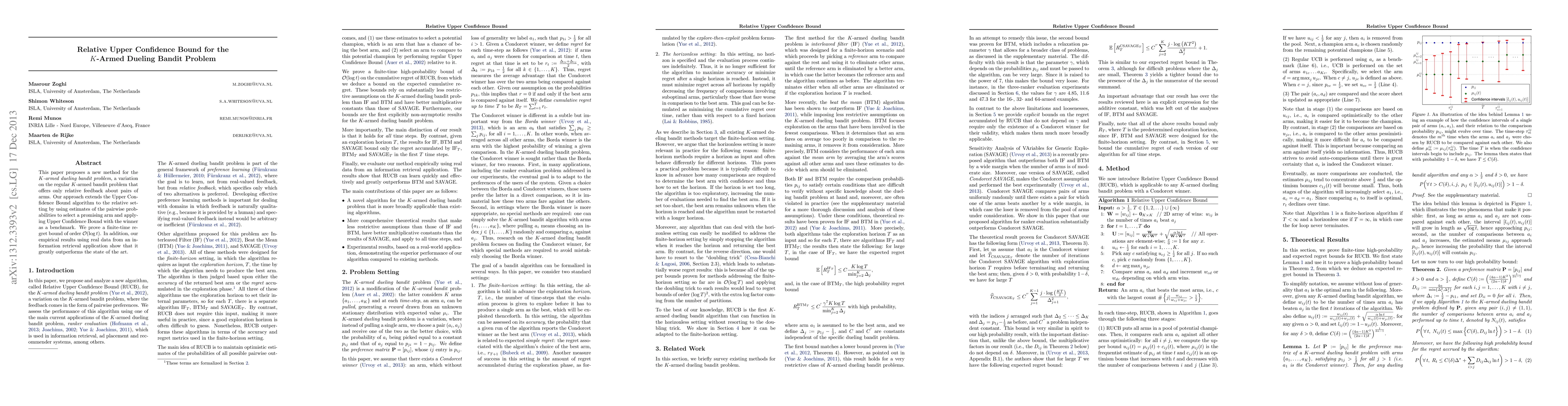 This paper introduces a new Relative Upper Confidence Bound (RUCB) method for the K-armed dueling bandit problem, which uses relative feedback to select promising arms. It achieves a finite-time regret bound of O(log t) and outperforms existing methods in an information retrieval application.