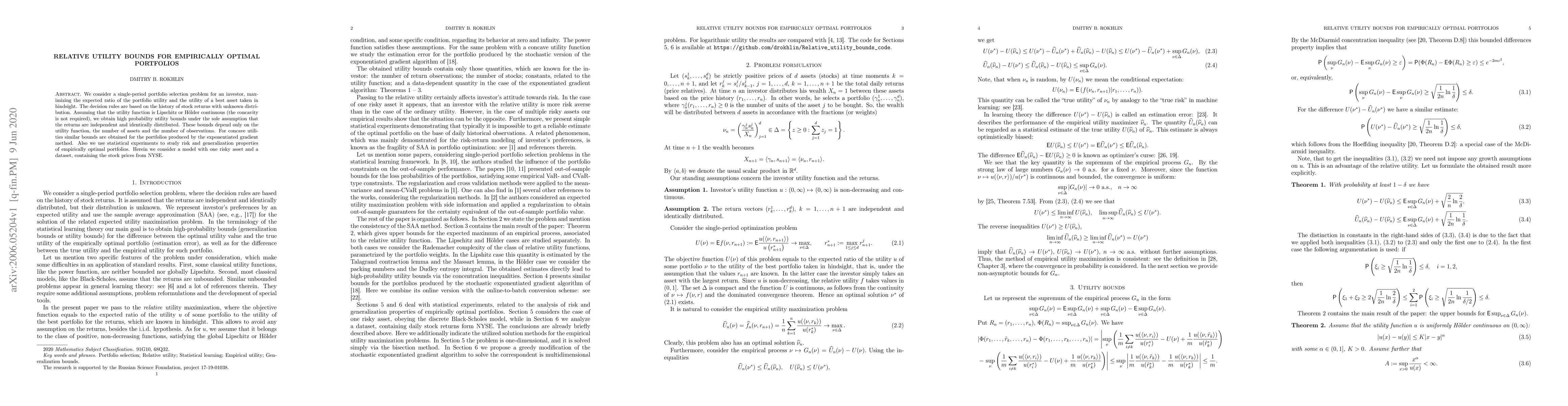 We consider a single-period portfolio selection problem for an investor, maximizing the expected ratio of the portfolio utility and the utility of a best asset taken in hindsight. The decision rules are based on the history of stock returns with unknown distribution. Assuming that the utility function is Lipschitz or H\"{o}lder continuous (the concavity is not required), we obtain high probability utility bounds under the sole assumption that the returns are independent and identically distributed. These bounds depend only on the utility function, the number of assets and the number of observations. For concave utilities similar bounds are obtained for the portfolios produced by the exponentiated gradient method. Also we use statistical experiments to study risk and generalization properties of empirically optimal portfolios. Herein we consider a model with one risky asset and a dataset, containing the stock prices from NYSE.