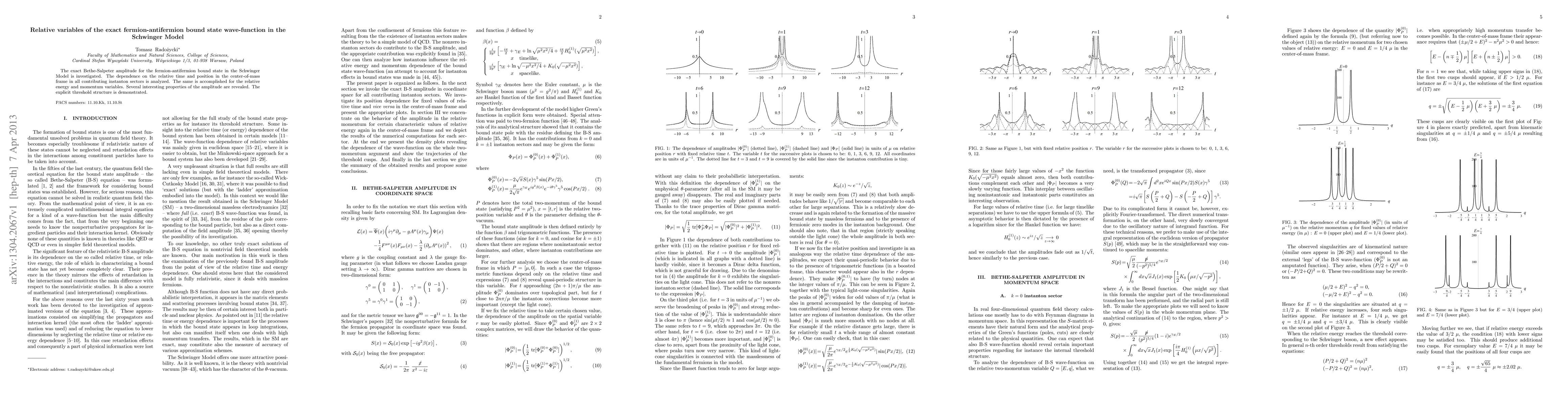 This paper investigates the exact Bethe-Salpeter amplitude for fermion-antifermion bound states in the Schwinger Model, analyzing the dependence on relative time, position, energy, and momentum in the center-of-mass frame. It reveals interesting properties and demonstrates an explicit threshold structure.