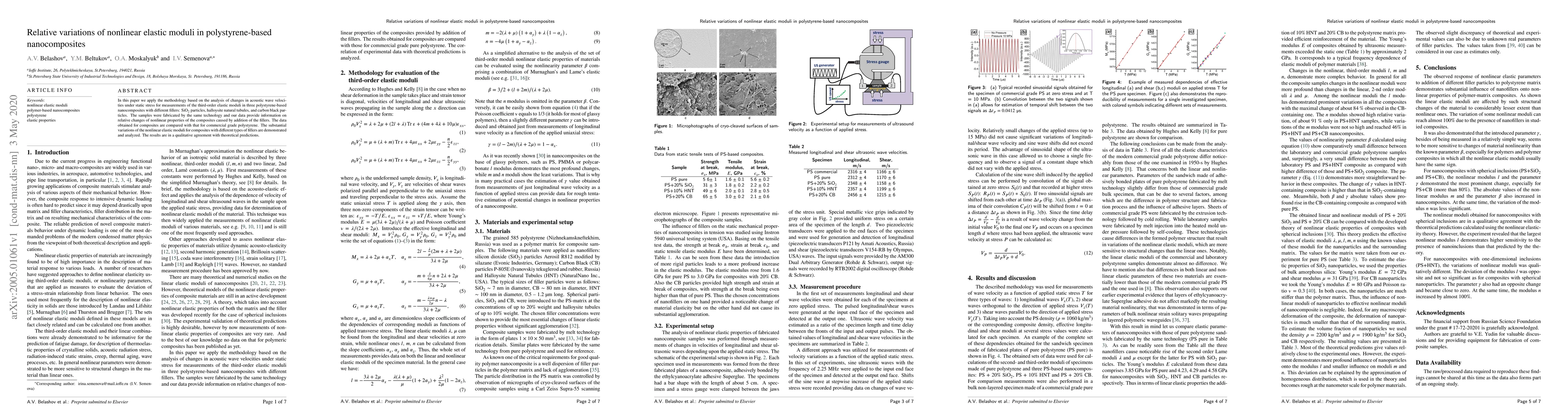 In this paper we apply the methodology based on the analysis of changes in acoustic wave velocities under static stress for measurements of the third-order elastic moduli in three polystyrene-based nanocomposites with different fillers: SiO2 particles, halloysite natural tubules, and carbon black particles. The samples were fabricated by the same technology and our data provide information on relative changes of nonlinear properties of the composites caused by addition of the fillers. The data obtained for composites are compared with that for commercial grade polystyrene. The substantial variations of the nonlinear elastic moduli for composites with different types of fillers are demonstrated and analyzed. The results are in a qualitative agreement with theoretical predictions.