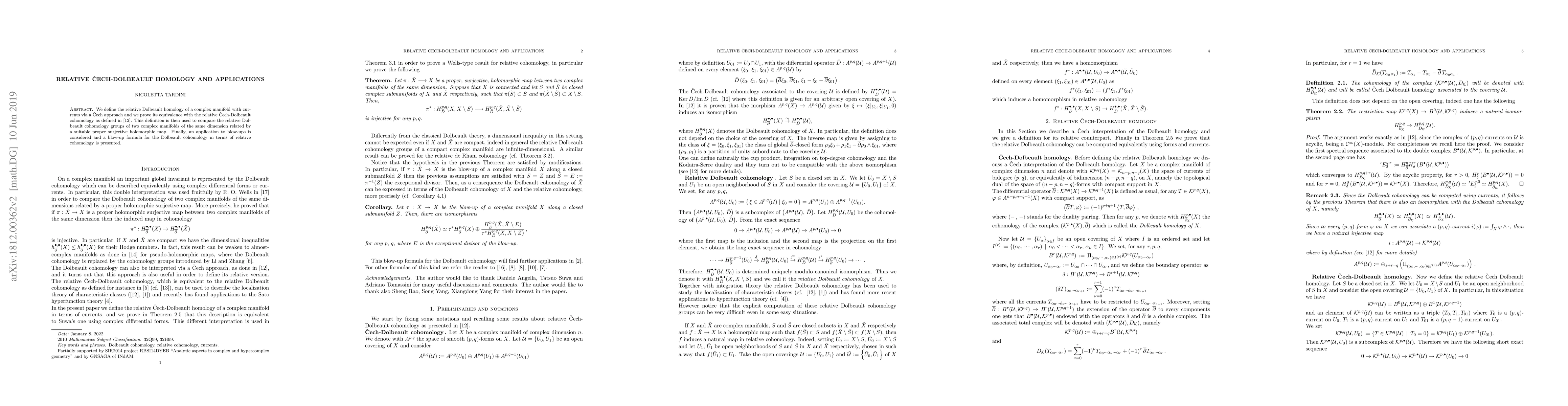 We define the relative Dolbeault homology of a complex manifold with currents via a \v{C}ech approach and we prove its equivalence with the relative \v{C}ech-Dolbeault cohomology as defined in [T. Suwa, \v{C}ech-Dolbeault cohomology and the $\overline\partial$-Thom class, {\em Singularities---Niigata---Toyama 2007}, 321--340, Adv. Stud. Pure Math., \textbf{56}, Math. Soc. Japan, Tokyo, 2009. ]. This definition is then used to compare the relative Dolbeault cohomology groups of two complex manifolds of the same dimension related by a suitable proper surjective holomorphic map. Finally, an application to blow-ups is considered.