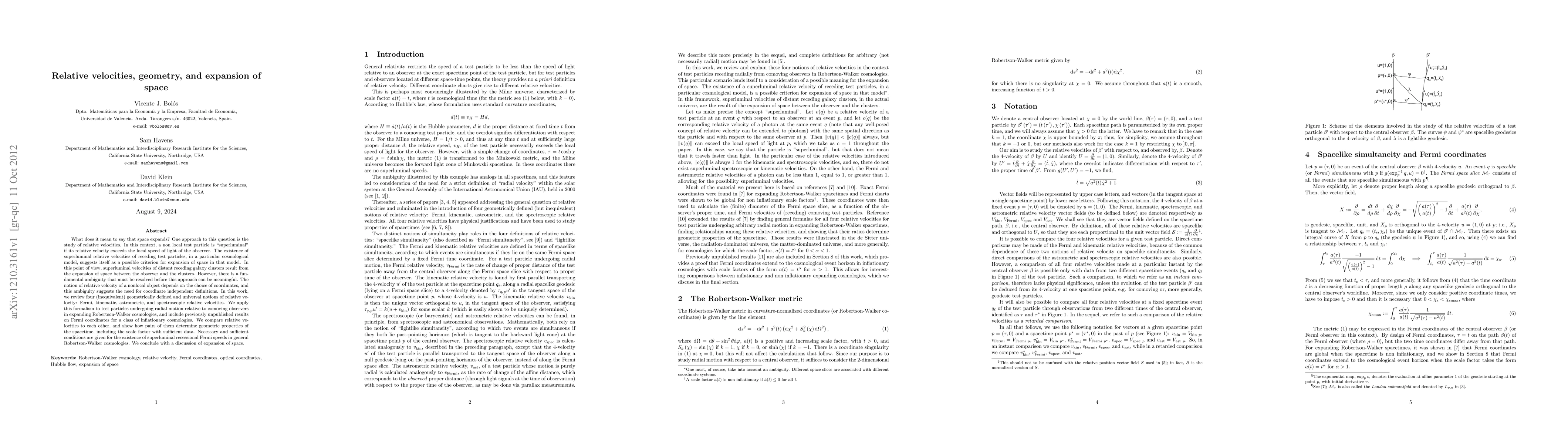 What does it mean to say that space expands? One approach to this question is the study of relative velocities. In this context, a non local test particle is "superluminal" if its relative velocity exceeds the local speed of light of the observer. The existence of superluminal relative velocities of receding test particles, in a particular cosmological model, suggests itself as a possible criterion for expansion of space in that model. In this point of view, superluminal velocities of distant receding galaxy clusters result from the expansion of space between the observer and the clusters. However, there is a fundamental ambiguity that must be resolved before this approach can be meaningful. The notion of relative velocity of a nonlocal object depends on the choice of coordinates, and this ambiguity suggests the need for coordinate independent definitions. In this work, we review four (inequivalent) geometrically defined and universal notions of relative velocity: Fermi, kinematic, astrometric, and spectroscopic relative velocities. We apply this formalism to test particles undergoing radial motion relative to comoving observers in expanding Robertson-Walker cosmologies, and include previously unpublished results on Fermi coordinates for a class of inflationary cosmologies. We compare relative velocities to each other, and show how pairs of them determine geometric properties of the spacetime, including the scale factor with sufficient data. Necessary and sufficient conditions are given for the existence of superluminal recessional Fermi speeds in general Robertson-Walker cosmologies. We conclude with a discussion of expansion of space.