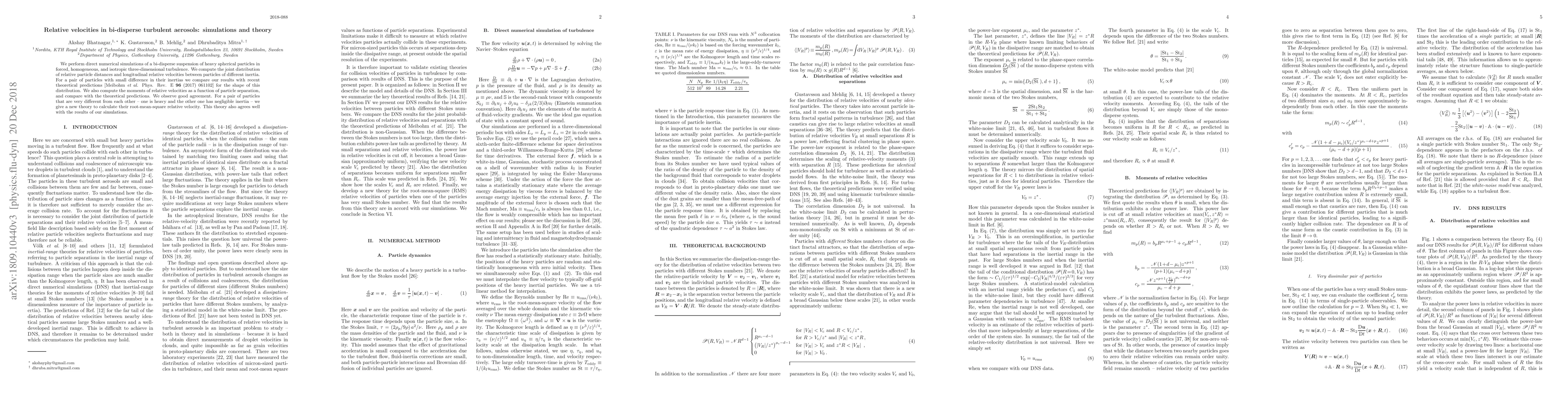 This paper presents direct numerical simulations of bi-disperse turbulent aerosols, analyzing the joint distribution of relative particle distances and velocities, and comparing results to theoretical predictions. The study finds good agreement between simulation outcomes and theoretical models for relative velocity moments.