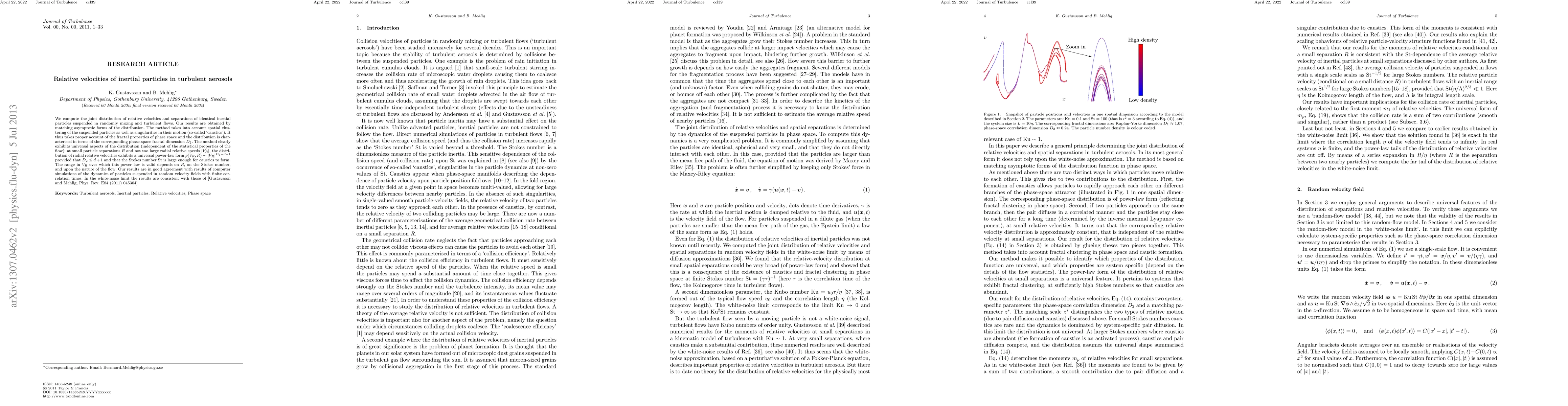 This paper investigates the joint distribution of relative velocities and separations of inertial particles in turbulent aerosols, revealing a universal power-law form for small separations and speeds. The method accounts for fractal properties, showing agreement with computer simulations and theoretical results in the white-noise limit.