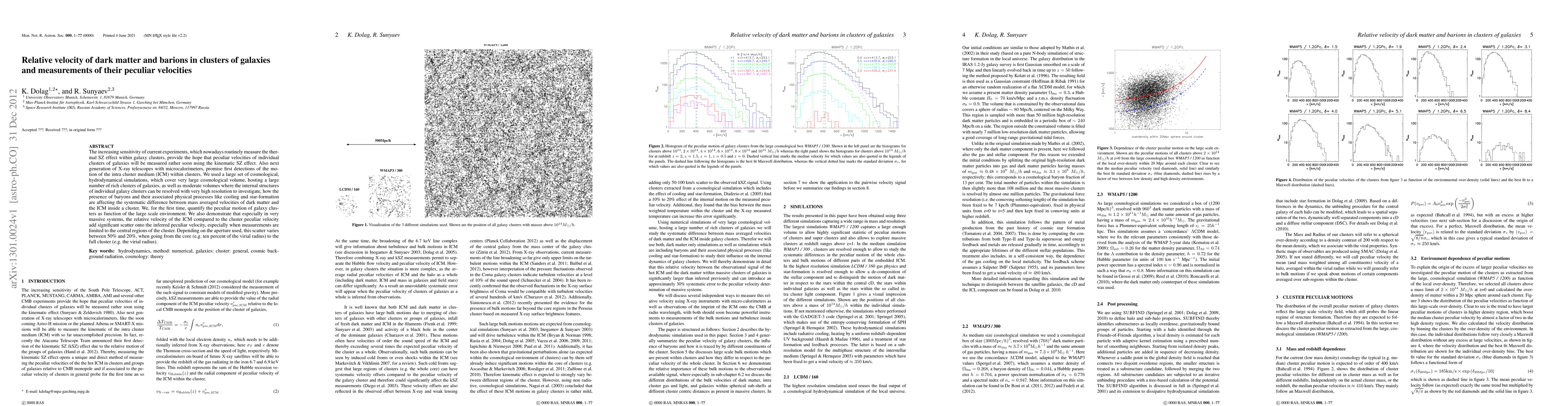 The increasing sensitivity of current experiments, which nowadays routinely measure the thermal SZ effect within galaxy clusters, provide the hope that peculiar velocities of individual clusters of galaxies will be measured rather soon using the kinematic SZ effect. Also next generation of X-ray telescopes with microcalorimeters, promise first detections of the motion of the intra cluster medium (ICM) within clusters. We used a large set of cosmological, hydrodynamical simulations, which cover very large cosmological volume, hosting a large number of rich clusters of galaxies, as well as moderate volumes where the internal structures of individual galaxy clusters can be resolved with very high resolution to investigate, how the presence of baryons and their associated physical processes like cooling and star-formation are affecting the systematic difference between mass averaged velocities of dark matter and the ICM inside a cluster. We, for the first time, quantify the peculiar motion of galaxy clusters as function of the large scale environment. We also demonstrate that especially in very massive systems, the relative velocity of the ICM compared to the cluster peculiar velocity add significant scatter onto the inferred peculiar velocity, especially when measurements are limited to the central regions of the cluster. Depending on the aperture used, this scatter varies between 50% and 20%, when going from the core (e.g. ten percent of the virial radius) to the full cluster (e.g. the virial radius).