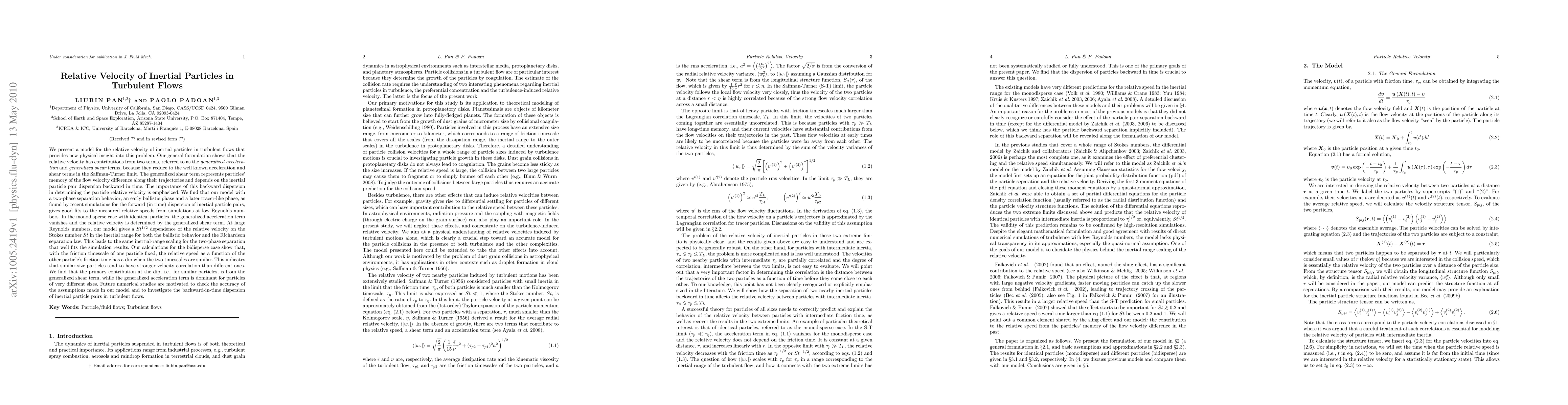 This paper develops a model for the relative velocity of inertial particles in turbulent flows, identifying contributions from generalized acceleration and shear terms. The model fits simulation results at low Reynolds numbers and shows a $St^{1/2}$ dependence on the Stokes number in the inertial range, explaining the two-phase separation behavior observed in simulations.