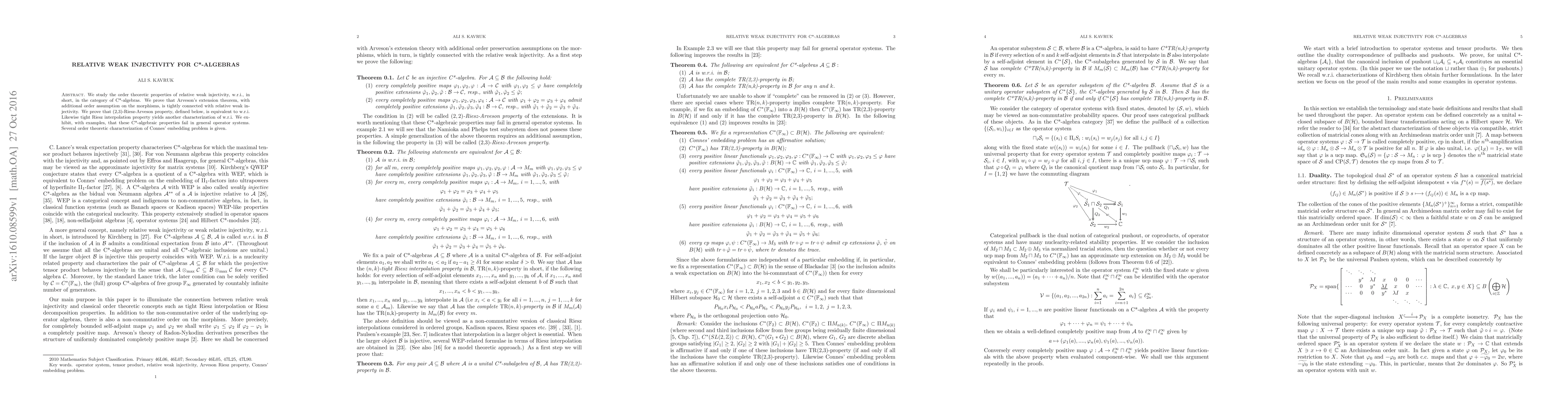 We study the order theoretic properties of relative weak injectivity, w.r.i., in short, in the category of C*-algebras. We prove that Arveson's extension theorem, with additional order assumption on the morphisms, is tightly connected with relative weak injectivity. We prove that (2,3)-Riesz-Arveson property, defined below, is equivalent to w.r.i. Likewise tight Riesz interpolation property yields another characterization of w.r.i. We exhibit, with examples, that these C*-algebraic properties fail in general operator systems. Several order theoretic characterization of Connes' embedding problem is given.