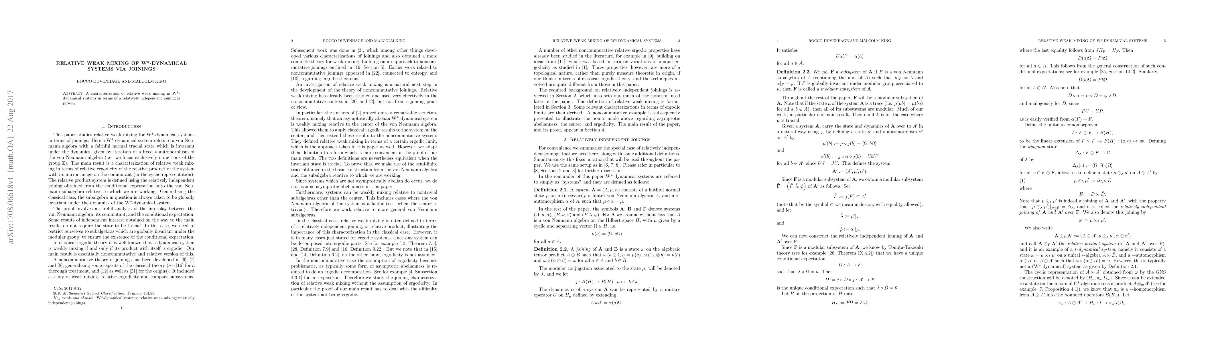 Summary: The paper provides a characterization of relative weak mixing in W*-dynamical systems through the concept of relatively independent joinings. It establishes a connection between these mixing properties and the structure of joinings in the system.