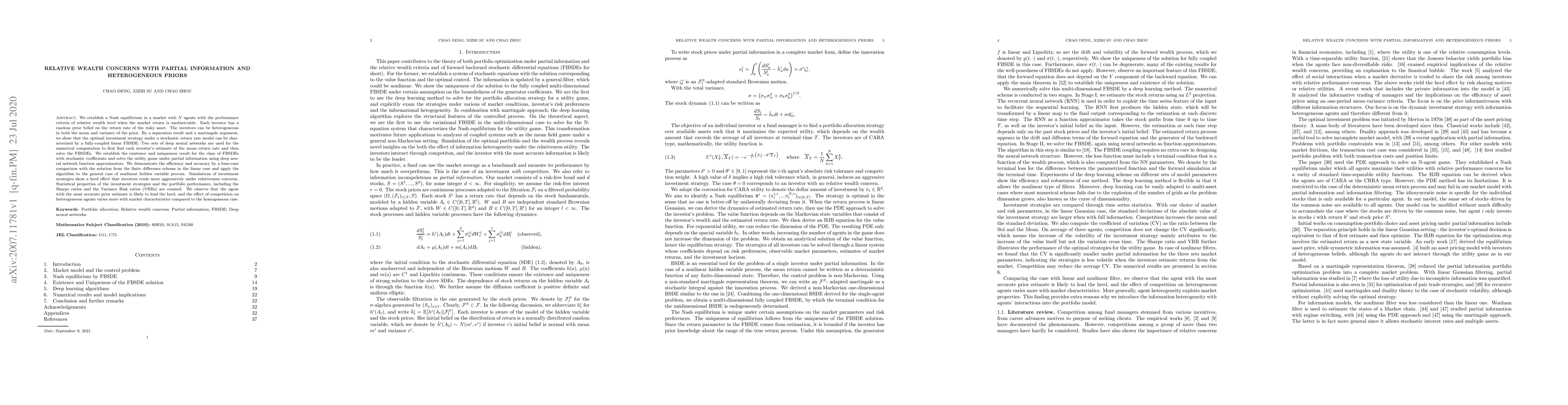 This research paper presents a Nash equilibrium model for a market with N agents focused on relative wealth, under unobservable return conditions and heterogeneous prior beliefs about risky asset returns. The optimal investment strategies are characterized using a linear fully-coupled stochastic differential equation (FBSDE). Deep neural networks are employed for numerical computations, demonstrating the existence and uniqueness of FBSDEs with stochastic coefficients. The study reveals a 'herd effect' where investors trade more aggressively due to relative wealth concerns. The most accurate prior estimators lead the herd, and competition impact varies with market characteristics more in heterogeneous agents compared to homogeneous ones.