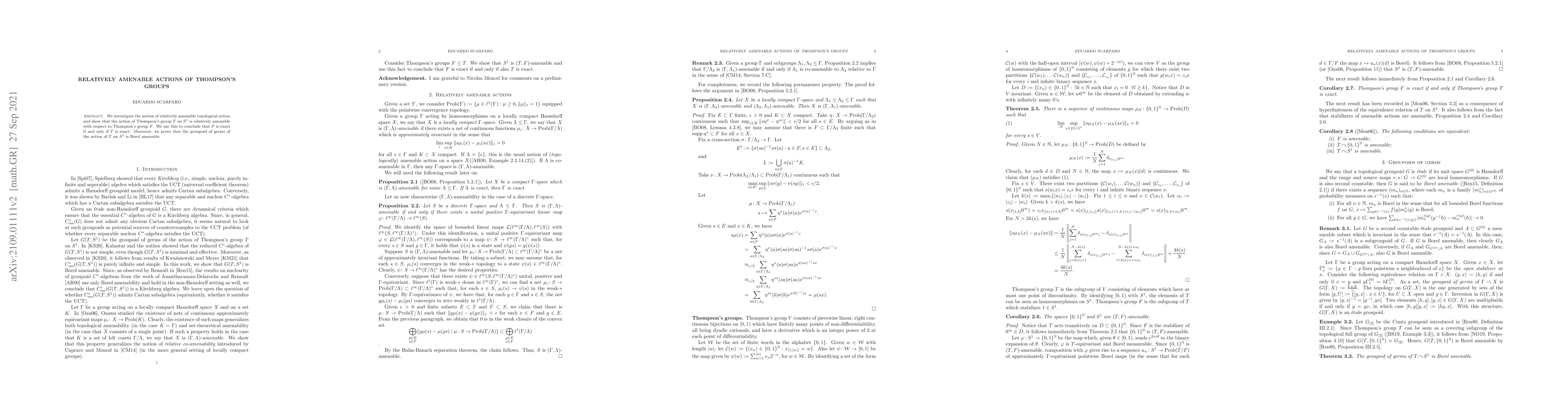 We investigate the notion of relatively amenable topological action and show that the action of Thompson's group $T$ on $S^1$ is relatively amenable with respect to Thompson's group $F$. We use this to conclude that $F$ is exact if and only if $T$ is exact. Moreover, we prove that the groupoid of germs of the action of $T$ on $S^1$ is Borel amenable.