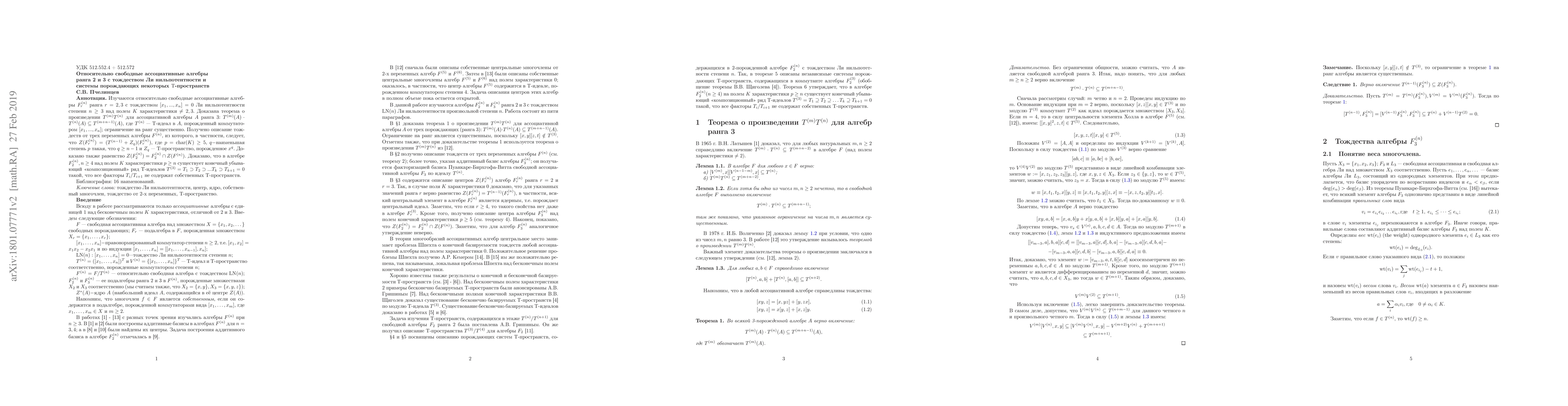 We study relatively free associative algebras $F^{(n)}_r$ of ranks $r=2,3$ with the identity $[x_1,\dots, x_n]=0$ of Lie nilpotency of step $n\geqslant 3$ over a field $K$ of characteristic $\neq 2,3$. First we prove a Theorem on the inclusion $ T^{(m)}T^{(n)}\subseteq T^{(m+n-1)}$ for an associative algebra $A$ of rank $3$, where $T^{(n)}=T^{(n)}(A)$ is a T-ideal of $A$ generated by the commutator $[x_1,\dots, x_n]$; the restriction on rank is essential. Further, we describe 3-variable identities of the algebra $F^{(n)}$. In particular, the obtained description implies that $Z(F^{(n)}_r)=(T^{(n-1)}+Z_q)(F^{(n)}_r)$, where $p=\mathrm{char}(K)\geqslant 5$ and $q$ is a least power of $p$ such that $q\geqslant n-1$ and $Z_q$ is a T-space generated by $x^q$. We also prove the equality $Z(F^{(n)}_2)=F^{(n)}_2\cap Z(F^{(n)})$. Finally, we obtain certain generalizations and refinements of some results by A. V. Grishin and V. V. Shchigolev, respectively. For example, we prove that a unital algebra $F^{(n)}_2$ $(n\geqslant 4)$ over a field $K$ of characteristic $p\geqslant n$ possesses a finite strictly descending "composition" series of T-ideals $T^{(3)}=T_1\supset T_2\supset \dots \supset T_k\supset T_{k+1}=0$ such that each quotient $T_i/T_{i+1}$ does not contain any proper T-spaces. Key words: Lie nilpotency identity, center, kernel, proper polynomial, 3-variable identity, T-space.