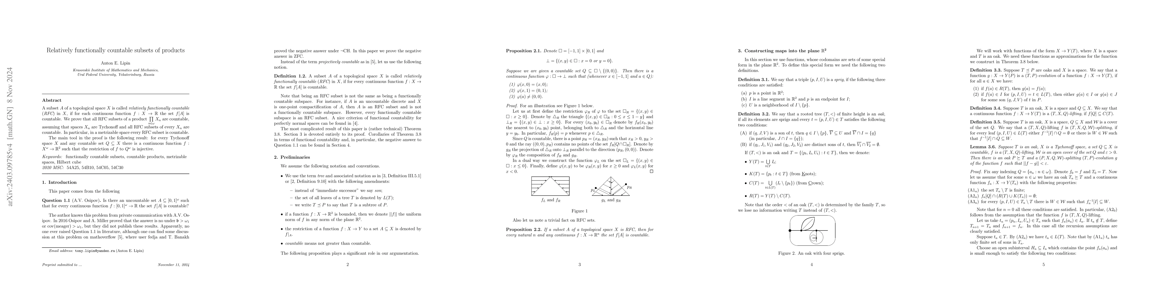 Summary: This paper proves that all relatively functionally countable (RFC) subsets of a product of Tychonoff spaces are countable, given that each RFC subset in each factor space is countable. It highlights a key result where for any countable subset in a Tychonoff space, a continuous function can be constructed that maps the product of the countable set to a countable subset in $\mathbb{R}^2$.