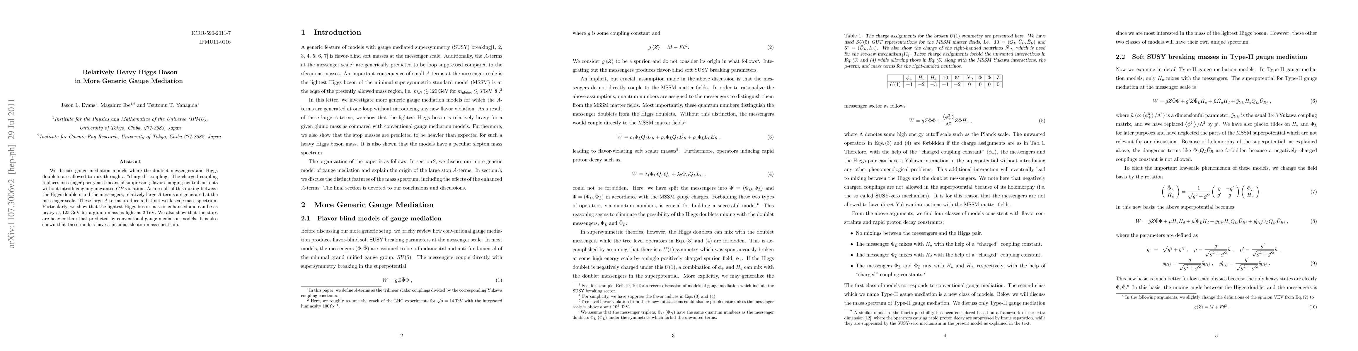 We discuss gauge mediation models where the doublet messengers and Higgs doublets are allowed to mix through a "charged" coupling. The charged coupling replaces messenger parity as a means of suppressing flavor changing neutral currents without introducing any unwanted CP violation. As a result of this mixing between the Higgs doublets and the messengers, relatively large A-terms are generated at the messenger scale. These large A-terms produce a distinct weak scale mass spectrum. Particularly, we show that the lightest Higgs boson mass is enhanced and can be as heavy as 125GeV for a gluino mass as light as 2TeV. We also show that the stops are heavier than that predicted by conventional gauge mediation models. It is also shown that these models have a peculiar slepton mass spectrum.