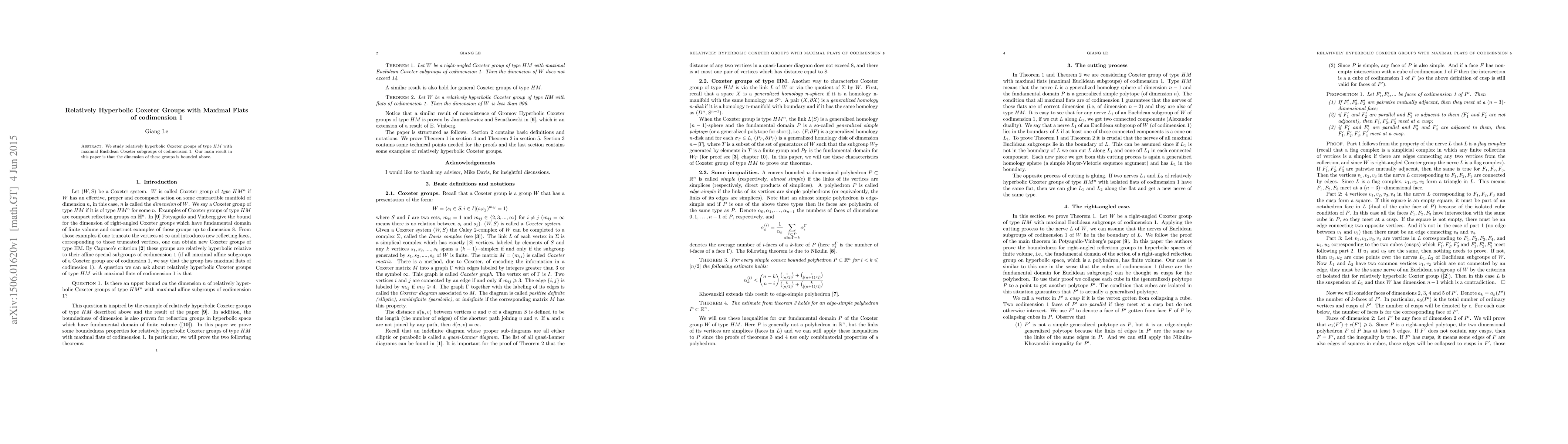 Title: Relatively Hyperbolic Coxeter Groups with maximal Flats of codimension 1 Summary: This paper investigates relatively hyperbolic Coxeter groups with maximal Euclidean Coxeter subgroups of codimension 1, concluding that the dimension of such groups is bounded above.