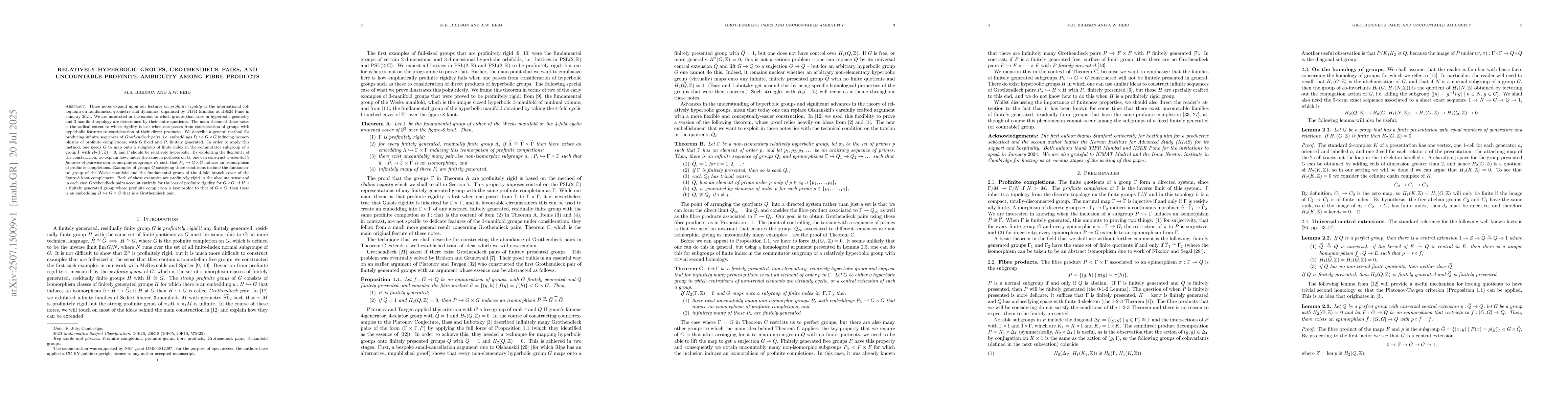 These notes expand upon our lectures on {\em profinite rigidity} at the international colloquium on randomness, geometry and dynamics, organised by TIFR Mumbai at IISER Pune in January 2024. We are interested in the extent to which groups that arise in hyperbolic geometry and 3-manifold topology are determined by their finite quotients. The main theme of these notes is the radical extent to which rigidity is lost when one passes from consideration of groups with hyperbolic features to consideration of their direct products. We describe a general method for producing infinite sequences of {\em{Grothendieck pairs,}} i.e.~embeddings $P_i\hookrightarrow G\times G$ inducing isomorphisms of profinite completions, with $G$ fixed and $P_i$ finitely generated. In order to apply this method, one needs $G$ to map onto a subgroup of finite index in the commutator subgroup of a group $\Gamma$ with $H_2(\Gamma,\mathbb{Z})=0$, and $\Gamma$ should be relatively hyperbolic. By exploiting the flexibility of the construction, we explain how, under the same hypotheses on $G$, one can construct {\em uncountable families} of pairwise non-isomorphic subgroups $P_\lambda$ such that $P_\lambda\hookrightarrow G\times G$ induces an isomorphism of profinite completions. Examples of groups $G$ satisfying these conditions include the fundamental group of the Weeks manifold and the fundamental group of the 4-fold branch cover of the figure-8 knot complement. Both of these examples are profinitely rigid in the absolute sense and in each case Grothendieck pairs account entirely for the loss of profinite rigidity for $G\times G$: if $H$ is a finitely generated group whose profinite completion is isomorphic to that of $G\times G$, then there is an embedding $H\hookrightarrow G\times G$ that is a Grothendieck pair.