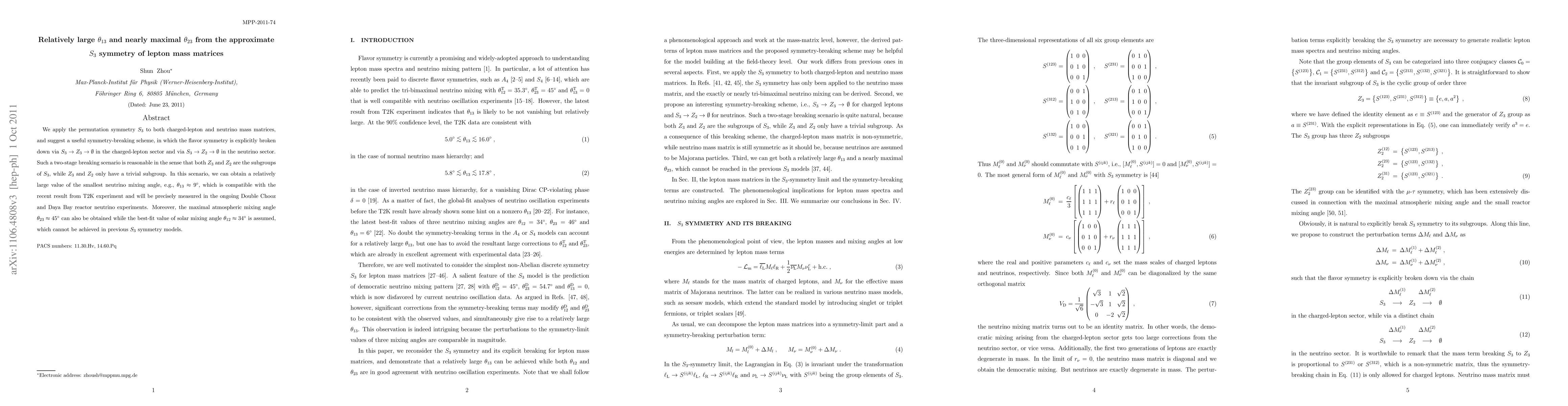 We apply the permutation symmetry S_3 to both charged-lepton and neutrino mass matrices, and suggest a useful symmetry-breaking scheme, in which the flavor symmetry is explicitly broken down via S_3 -> Z_3 -> nothing in the charged-lepton sector and via S_3 -> Z_2 -> nothing in the neutrino sector. Such a two-stage breaking scenario is reasonable in the sense that both Z_3 and Z_2 are the subgroups of S_3, while Z_3 and Z_2 only have a trivial subgroup. In this scenario, we can obtain a relatively large value of the smallest neutrino mixing angle, e.g., theta_{13} ~ 9^\circ, which is compatible with the recent result from T2K experiment and will be precisely measured in the ongoing Double Chooz and Daya Bay reactor neutrino experiments. Moreover, the maximal atmospheric mixing angle theta_{23} ~ 45^\circ can also be obtained while the best-fit value of solar mixing angle theta_{12} ~ 34^\circ is assumed, which cannot be achieved in previous S_3 symmetry models.
