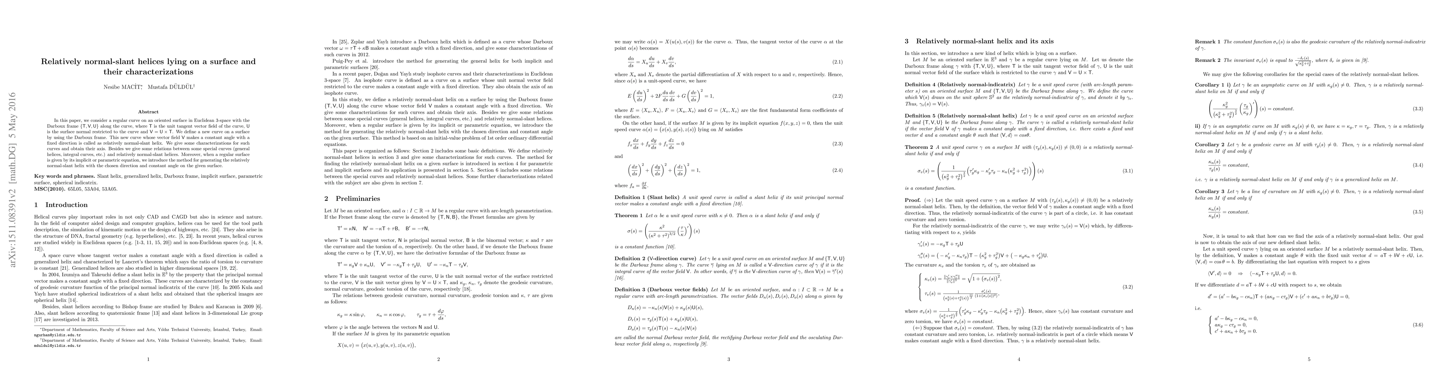 In this paper, we consider a regular curve on an oriented surface in Euclidean 3-space with the Darboux frame $\{\mathsf{T},\mathsf{V},\mathsf{U}\}$ along the curve, where $\mathsf{T}$ is the unit tangent vector field of the curve, $\mathsf{U}$ is the surface normal restricted to the curve and $\mathsf{V}=\mathsf{U}\times \mathsf{T}$. We define a new curve on a surface by using the Darboux frame. This new curve whose vector field $\mathsf{V}$ makes a constant angle with a fixed direction is called as relatively normal-slant helix. We give some characterizations for such curves and obtain their axis. Besides we give some relations between some special curves (general helices, integral curves, etc.) and relatively normal-slant helices. Moreover, when a regular surface is given by its implicit or parametric equation, we introduce the method for generating the relatively normal-slant helix with the chosen direction and constant angle on the given surface.