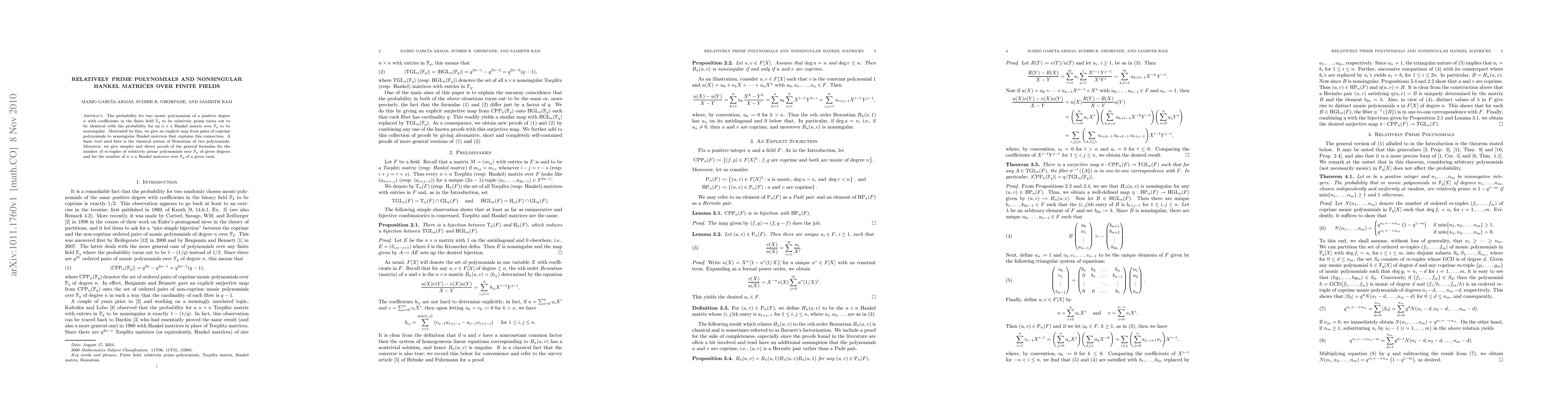 This paper establishes a probability equivalence between two monic polynomials in a finite field being relatively prime and an n x n Hankel matrix over the same field being nonsingular. It provides an explicit mapping from coprime polynomial pairs to nonsingular Hankel matrices, utilizing the Bezoutian concept, and offers simplified proofs for counts of relatively prime polynomial tuples and Hankel matrix ranks.