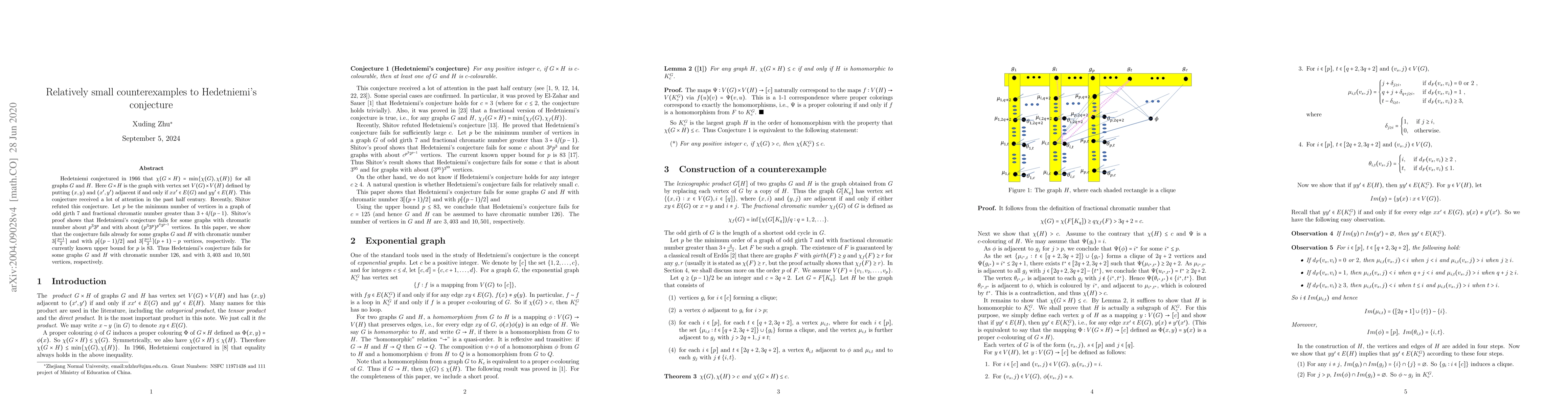 Hedetniemi conjectured in 1966 that $\chi(G \times H) = \min\{\chi(G), \chi(H)\}$ for all graphs $G$ and $H$. Here $G\times H$ is the graph with vertex set $ V(G)\times V(H)$ defined by putting $(x,y)$ and $(x',y')$ adjacent if and only if $xx'\in E(G)$ and $yy'\in E(H)$. This conjecture received a lot of attention in the past half century. Recently, Shitov refuted this conjecture. Let $p$ be the minimum number of vertices in a graph of odd girth $7$ and fractional chromatic number greater than $3+4/(p-1)$. Shitov's proof shows that Hedetniemi's conjecture fails for some graphs with chromatic number about $p^22^{p+1} $ and with about $(p^22^{p+1})^{p^32^{p-1}} $ vertices. In this paper, we show that the conjecture fails already for some graphs $G$ and $H$ with chromatic number $3\lceil \frac {p+1}2 \rceil $ and with $p \lceil (p-1)/2 \rceil$ and $3 \lceil \frac {p+1}2 \rceil (p+1)-p$ vertices, respectively. The currently known upper bound for $p$ is $148$. Thus Hedetniemi's conjecture fails for some graphs $G$ and $H$ with chromatic number $225$, and with $10,952$ and $33,377$ vertices, respectively.