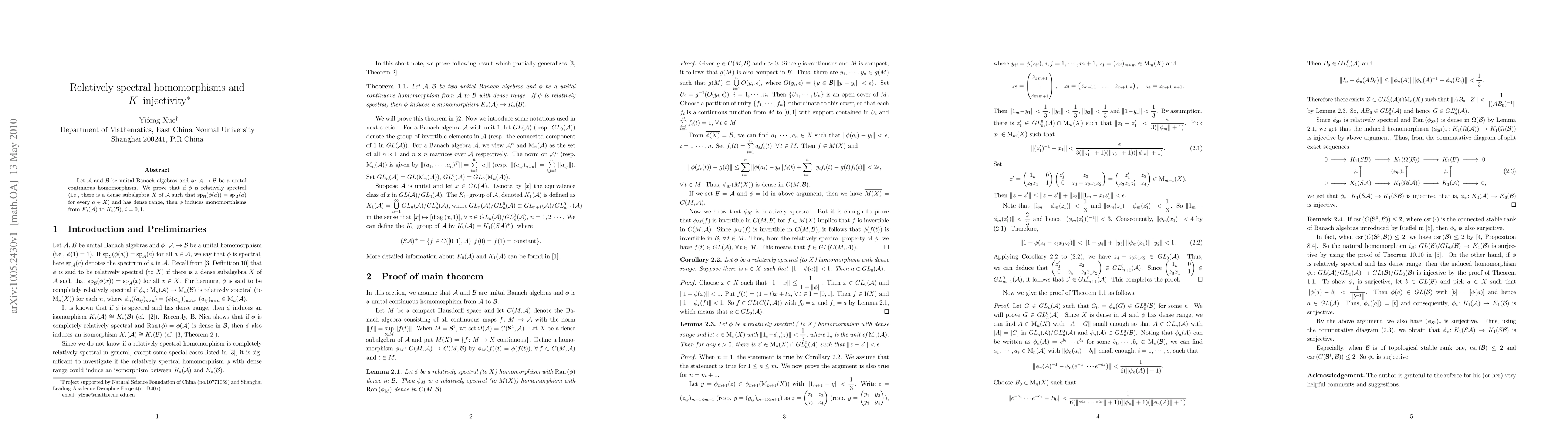 Let $\A$ and $\B$ be unital Banach algebras and $\phi\colon\A\to\B$ be a unital continuous homomorphism. We prove that if $\phi$ is relatively spectral (i.e., there is a dense subalgebra $X$ of $\A$ such that $\sp_\B(\phi(a))=\sp_\A(a)$ for every $a\in X$) and has dense range, then $\phi$ induces monomorphisms from $K_i(\A)$ to $K_i(\B)$, $i=0,1$.