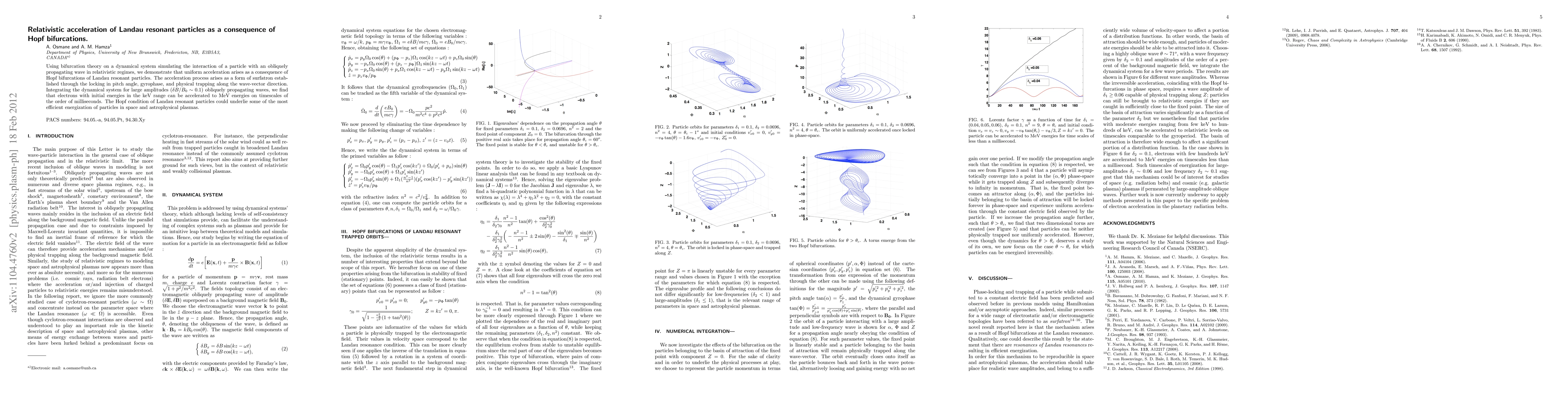 This paper demonstrates that Hopf bifurcations in relativistic regimes can lead to uniform acceleration of Landau resonant particles, establishing a surfatron mechanism. Electrons initially in the keV range can be accelerated to MeV energies within milliseconds, suggesting this process may be a key factor in efficient particle energization in space and astrophysical plasmas.