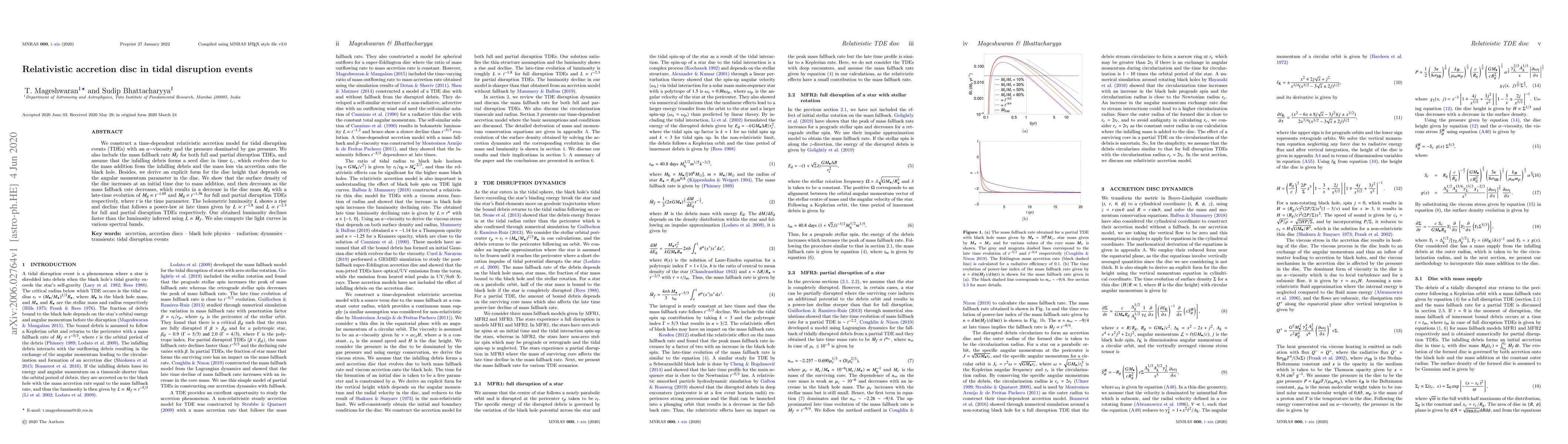 This paper develops a relativistic accretion model for tidal disruption events (TDEs) that includes gas pressure and mass fallback rates, showing that the disc mass and luminosity decline with time as $M_{\rm d} \propto t^{-1.05}$ and $L \propto t^{-1.8}$ for full disruptions, and $M_{\rm d} \propto t^{-1.38}$ and $L \propto t^{-2.3}$ for partial disruptions.