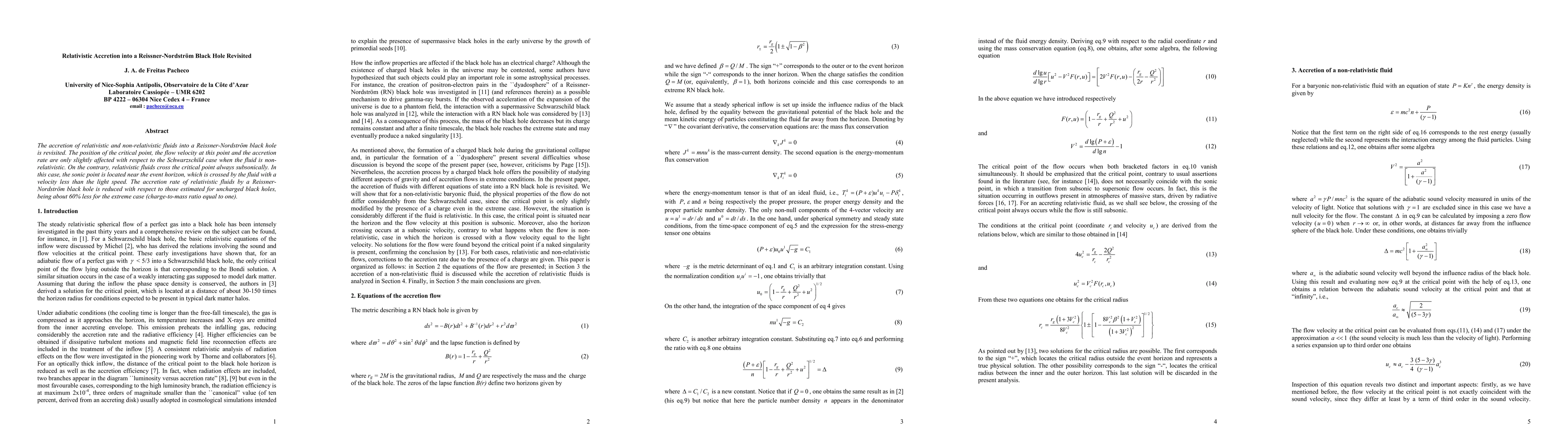 This paper revisits the dynamics of accretion into a Reissner-Nordström black hole, finding that relativistic fluids always cross the critical point subsonically, while non-relativistic fluids show minor differences compared to Schwarzschild black holes. The accretion rate for relativistic fluids is significantly reduced, especially for highly charged black holes.