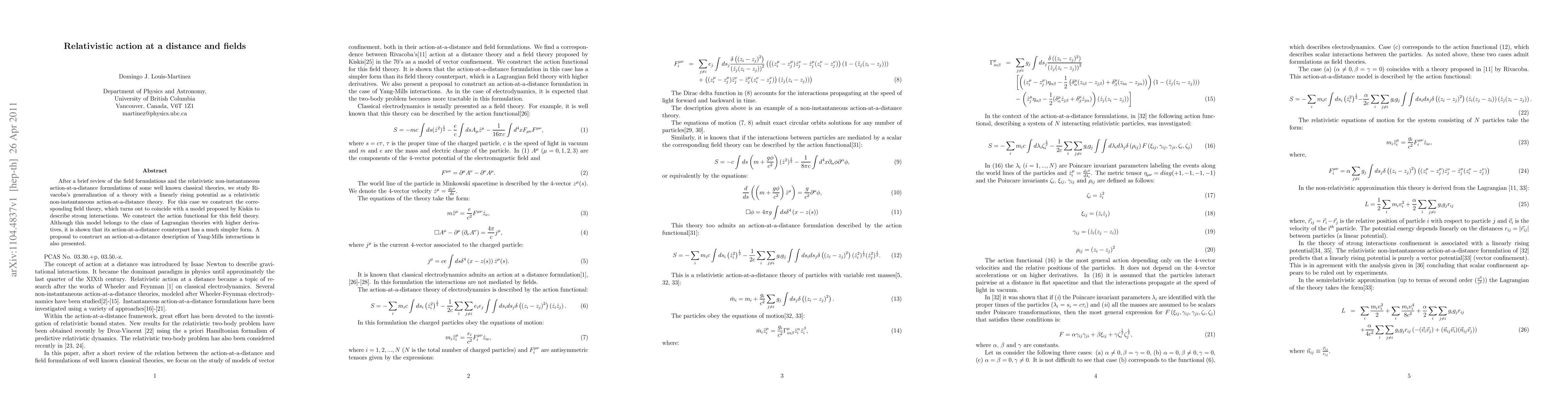 After a brief review of the field formulations and the relativistic non-instantaneous action-at-a-distance formulations of some well known classical theories, we study Rivacoba's generalization of a theory with a linearly rising potential as a relativistic non-instantaneous action-at-a-distance theory. For this case we construct the corresponding field theory, which turns out to coincide with a model proposed by Kiskis to describe strong interactions. We construct the action functional for this field theory. Although this model belongs to the class of Lagrangian theories with higher derivatives, it is shown that its action-at-a-distance counterpart has a much simpler form. A proposal to construct an action-at-a-distance description of Yang-Mills interactions is also presented.