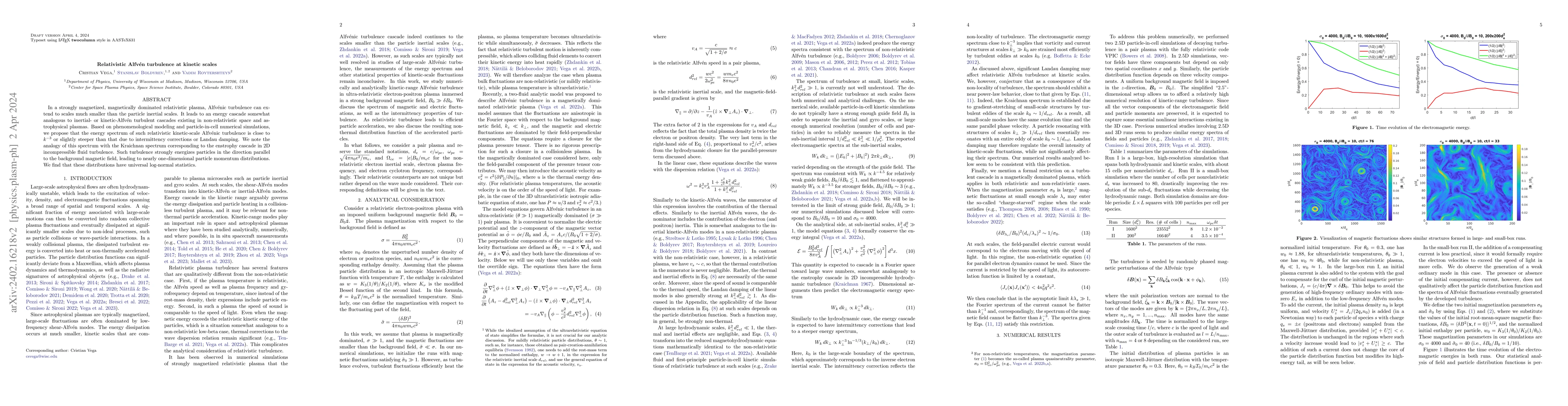 This research investigates relativistic Alfvén turbulence in magnetized plasmas, showing that it cascades to kinetic scales, similar to non-relativistic turbulence, with a $k^{-3}$ energy spectrum. Such turbulence energizes particles parallel to magnetic fields, resulting in log-normal particle momentum distributions.