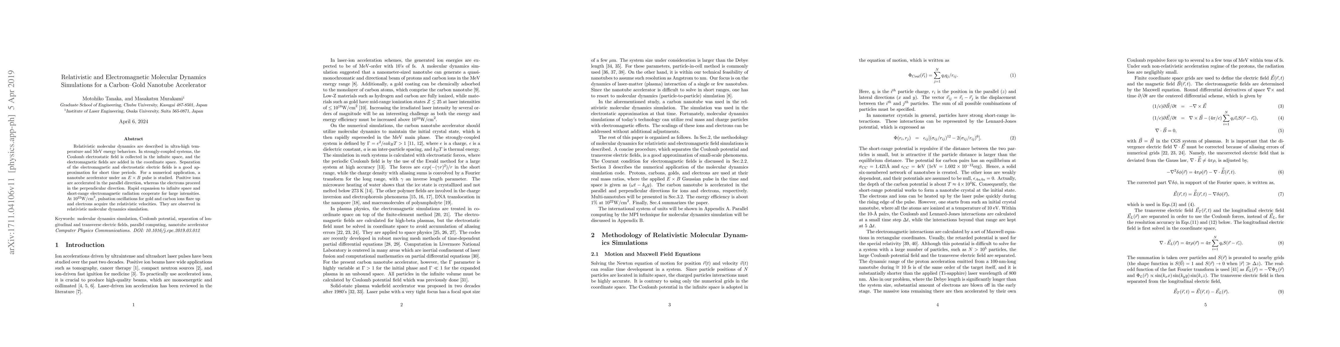 Relativistic molecular dynamics are described in ultra-high temperature and MeV energy behaviors. In strongly-coupled systems, the Coulomb electrostatic field is collected in the infinite space, and the electromagnetic fields are added in the coordinate space. Separation of the electromagnetic and electrostatic electric fields is a good approximation for short time periods. For a numerical application, a nanotube accelerator under an $E \times B$ pulse is studied. Positive ions are accelerated in the parallel direction, whereas the electrons proceed in the perpendicular direction. Rapid expansion to infinite space and short-range electromagnetic radiation cooperate for large intensities. At $10^{22}\rm{W/cm}^{2}$, pulsation oscillations for gold and carbon ions flare up and electrons acquire the relativistic velocities. They are observed in relativistic molecular dynamics simulation.