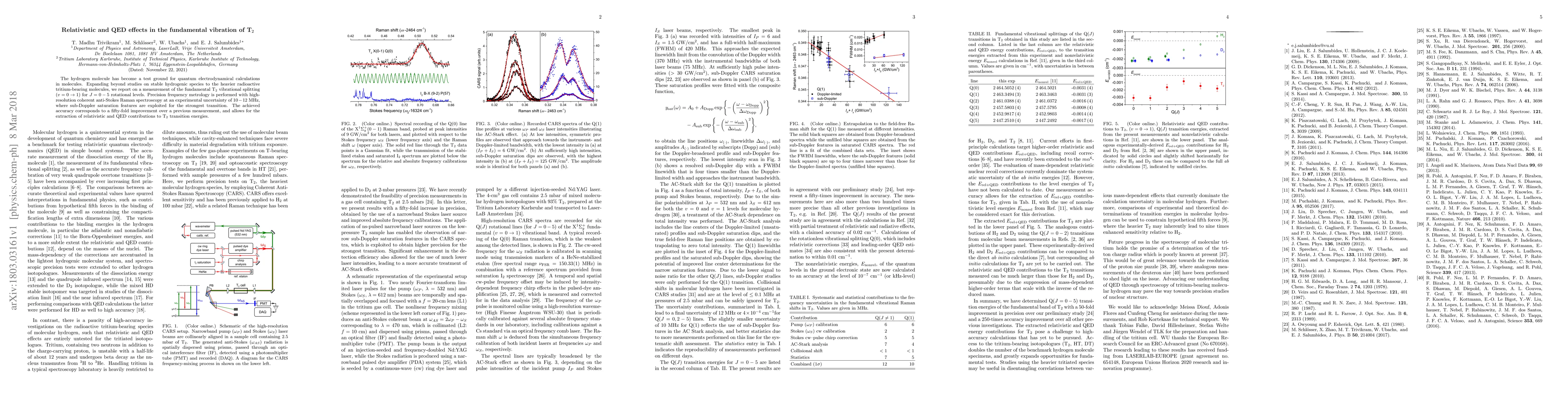 The hydrogen molecule has become a test ground for quantum electrodynamical calculations in molecules. Expanding beyond studies on stable hydrogenic species to the heavier radioactive tritium-bearing molecules, we report on a measurement of the fundamental T$_2$ vibrational splitting $(v= 0 \rightarrow 1)$ for $J=0-5$ rotational levels. Precision frequency metrology is performed with high-resolution coherent anti-Stokes Raman spectroscopy at an experimental uncertainty of $10-12$~MHz, where sub-Doppler saturation features are exploited for the strongest transition. The achieved accuracy corresponds to a fifty-fold improvement over a previous measurement, and allows for the extraction of relativistic and QED contributions to T$_2$ transition energies.