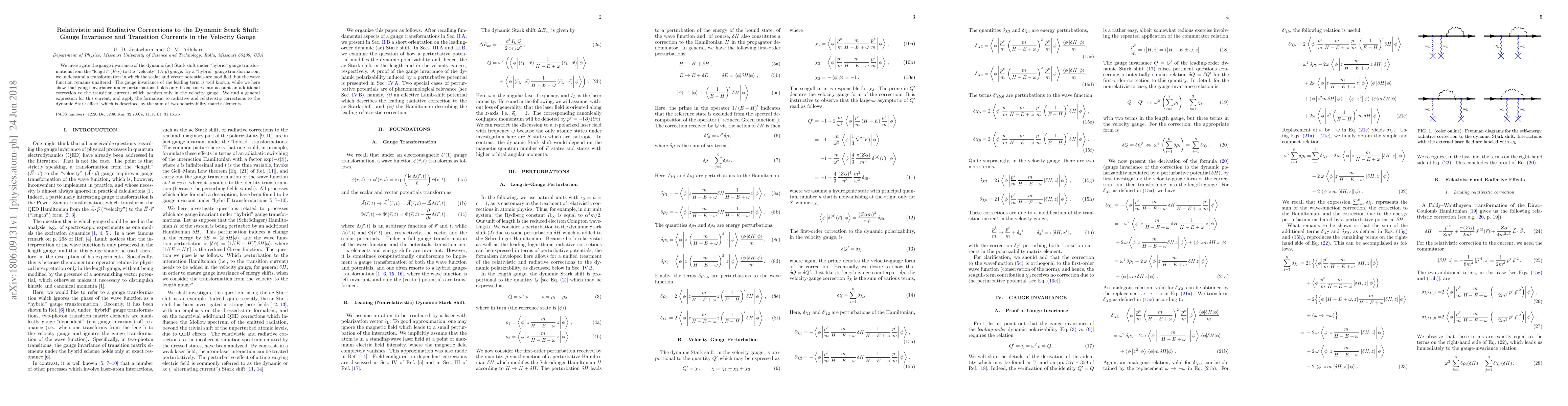 We investigate the gauge invariance of the dynamic (ac) Stark shift under "hybrid" gauge transformations from the "length" (E.r) to the "velocity" (A.p) gauge. By a "hybrid" gauge transformation, we understand a transformation in which the scalar and vector potentials are modified, but the wave function remains unaltered. The gauge invariance of the leading term is well known, while we here show that gauge invariance under perturbations holds only if one takes into account an additional correction to the transition current, which persists only in the velocity gauge. We find a general expression for this current, and apply the formalism to radiative and relativistic corrections to the dynamic Stark effect, which is described by the sum of two polarizability matrix elements.