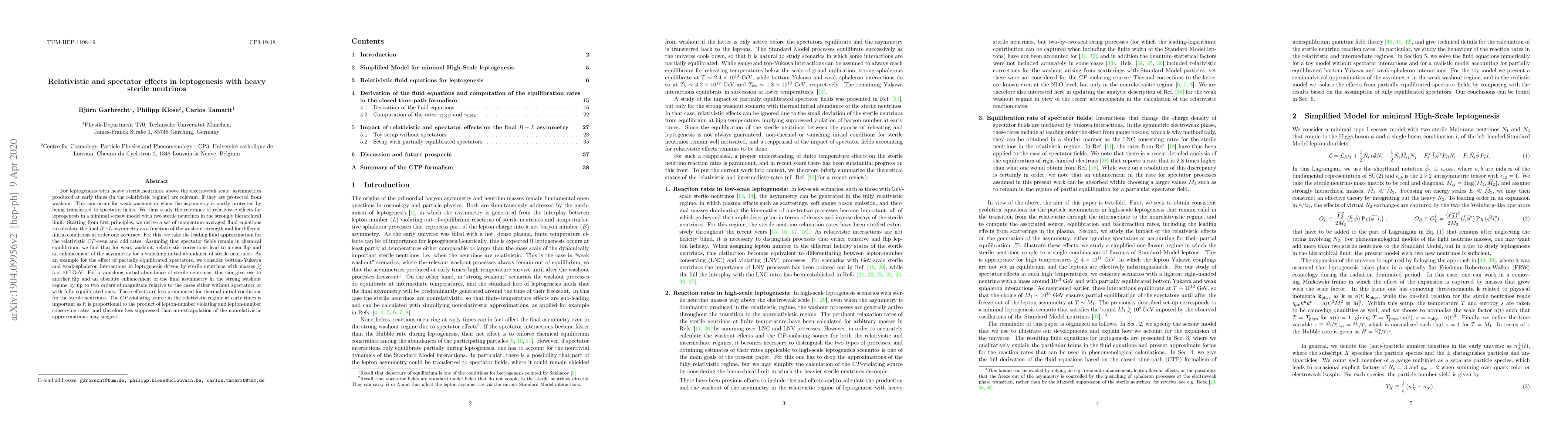 For leptogenesis with heavy sterile neutrinos above the electroweak scale, asymmetries produced at early times (in the relativistic regime) are relevant, if they are protected from washout. This can occur for weak washout or when the asymmetry is partly protected by being transferred to spectator fields. We thus study the relevance of relativistic effects for leptogenesis in a minimal seesaw model with two sterile neutrinos in the strongly hierarchical limit. Starting from first principles, we derive a set of momentum-averaged fluid equations to calculate the final $B-L$ asymmetry as a function of the washout strength and for different initial conditions at order one accuracy. For this, we take the leading fluid approximation for the relativistic $CP$-even and odd rates. Assuming that spectator fields remain in chemical equilibrium, we find that for weak washout, relativistic corrections lead to a sign flip and an enhancement of the asymmetry for a vanishing initial abundance of sterile neutrinos. As an example for the effect of partially equilibrated spectators, we consider bottom-Yukawa and weak-sphaleron interactions in leptogenesis driven by sterile neutrinos with masses $\gtrsim 5\times10^{12}$ GeV. For a vanishing initial abundance of sterile neutrinos, this can give rise to another flip and an absolute enhancement of the final asymmetry in the strong washout regime by up to two orders of magnitude relative to the cases either without spectators or with fully equilibrated ones. These effects are less pronounced for thermal initial conditions for the sterile neutrinos. The $CP$-violating source in the relativistic regime at early times is important as it is proportional to the product of lepton-number violating and lepton-number conserving rates, and therefore less suppressed than an extrapolation of the nonrelativistic approximations may suggest.