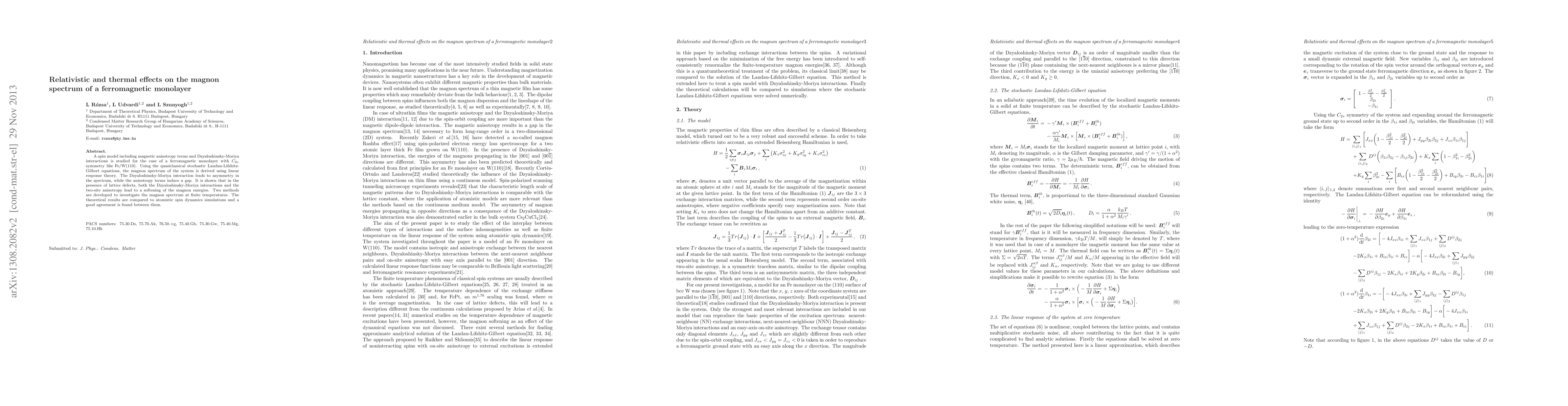 A spin model including magnetic anisotropy terms and Dzyaloshinsky-Moriya interactions is studied for the case of a ferromagnetic monolayer with C2v symmetry like Fe/W(110). Using the quasiclassical stochastic Landau-Lifshitz-Gilbert equations, the magnon spectrum of the system is derived using linear response theory. The Dzyaloshinsky-Moriya interaction leads to asymmetry in the spectrum, while the anisotropy terms induce a gap. It is shown that in the presence of lattice defects, both the Dzyaloshinsky-Moriya interactions and the two-site anisotropy lead to a softening of the magnon energies. Two methods are developed to investigate the magnon spectrum at finite temperatures. The theoretical results are compared to atomistic spin dynamics simulations and a good agreement is found between them.