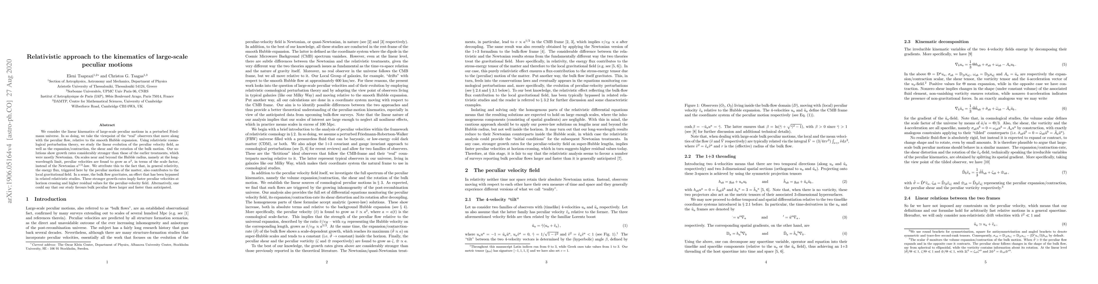 This paper employs relativistic cosmological perturbation theory to analyze the kinematics of large-scale peculiar motions in a perturbed Friedmann universe, revealing that peculiar velocities grow as $a^2$ rather than the Newtonian $a^{1/2}$-law due to the gravitational effects of energy flux. The study suggests bulk peculiar flows are larger and faster than previously anticipated.