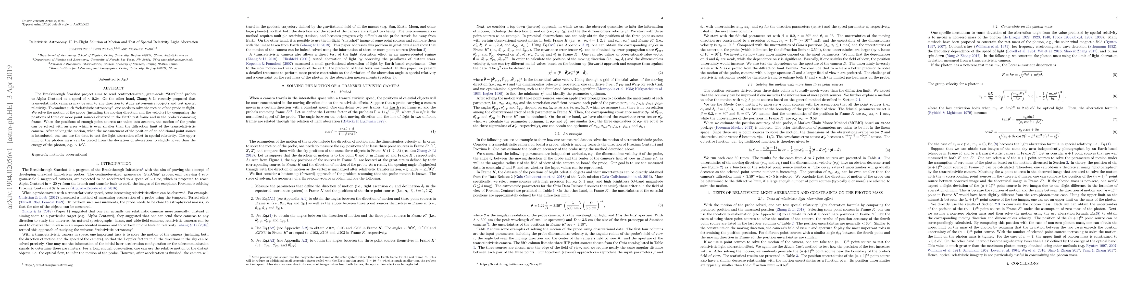 This paper presents a method to solve the motion of relativistic probes like those in the Breakthrough Starshot project, enabling "relativistic astronomy." It uses the positions of multiple point sources to determine probe velocity and direction, achieving precision below the diffraction limit. The study also tests special relativity's light aberration effect, placing an upper limit on the photon mass at around 1 eV.