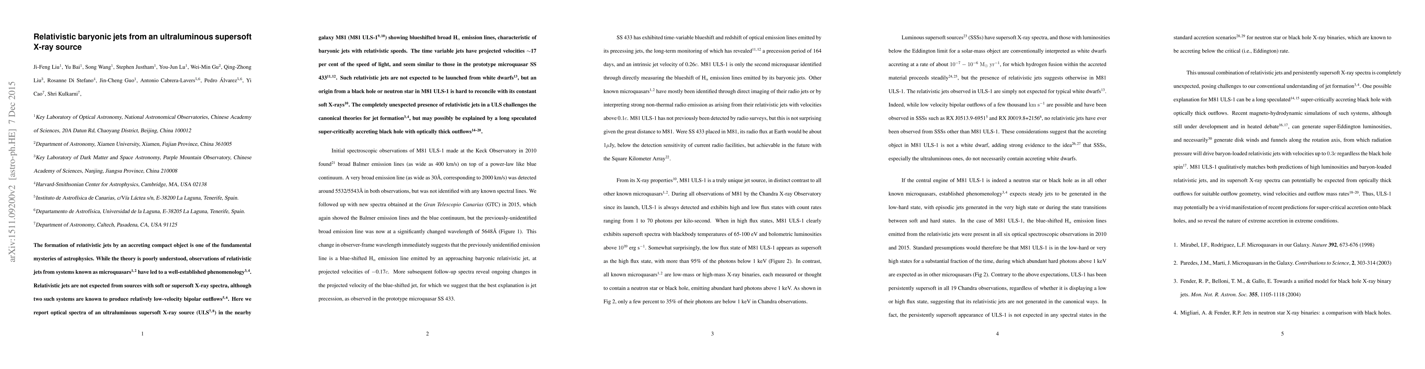 This paper reports the discovery of relativistic baryonic jets in an ultraluminous supersoft X-ray source (ULS) in the galaxy M81, challenging existing theories of jet formation. The jets, with velocities around 17% of the speed of light, resemble those in microquasars, despite the unexpected nature of such high-speed jets in a ULS.