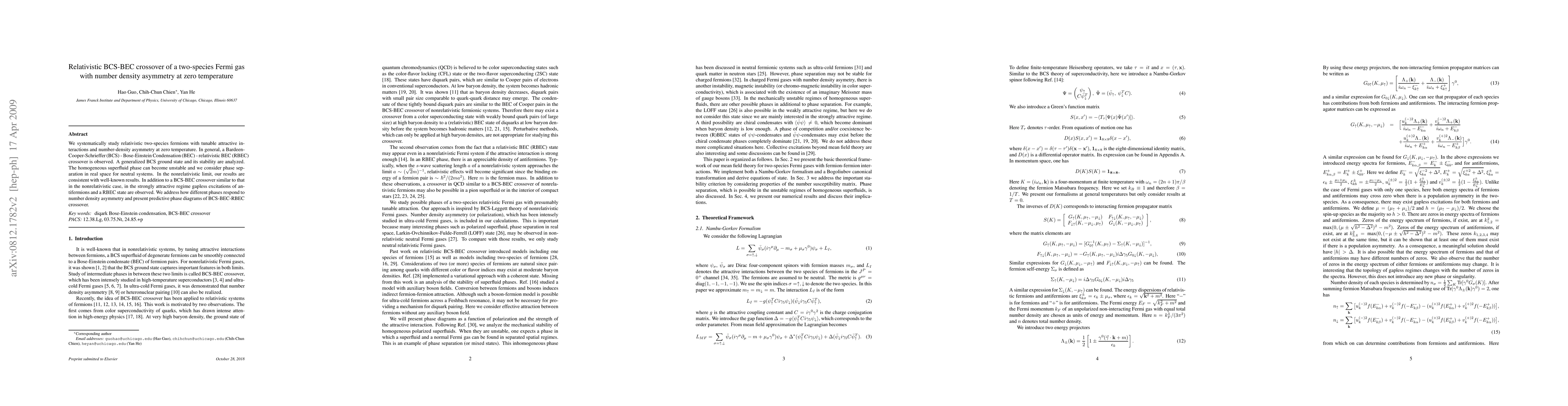 This paper investigates the relativistic BCS-BEC crossover in a two-species Fermi gas with tunable attractive interactions and number-density asymmetry at zero temperature. It finds a generalized BCS ground state and analyzes its stability, revealing phase separation in neutral systems and gapless excitations in the strongly attractive regime.
