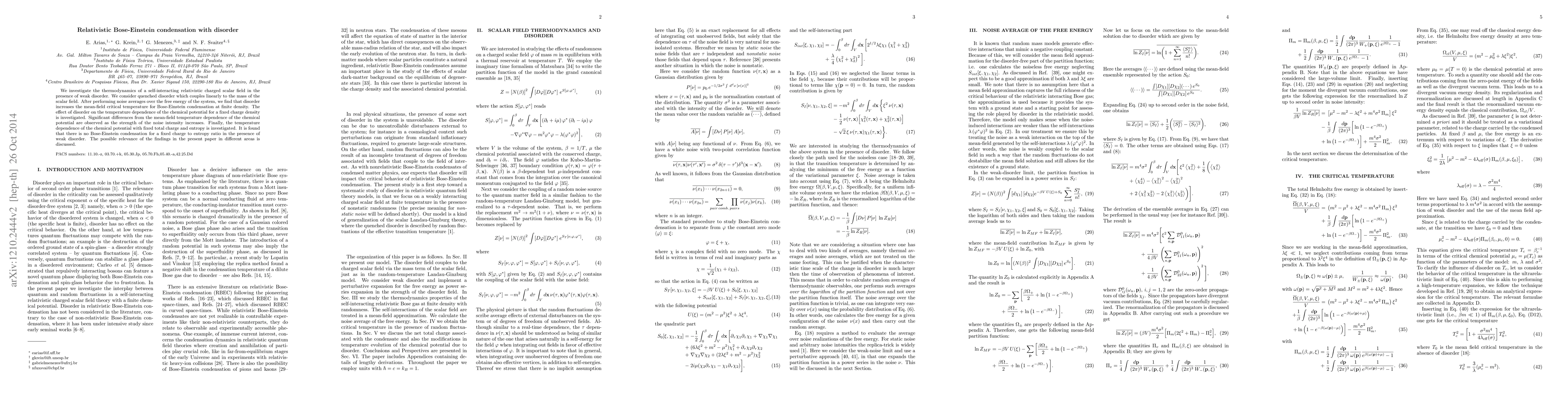 This study examines the thermodynamics of a relativistic charged scalar field under weak disorder, revealing that disorder elevates the critical temperature for Bose-Einstein condensation at finite density. Notably, strong disorder alters the chemical potential's temperature dependence and precludes condensation under fixed charge-to-entropy conditions.