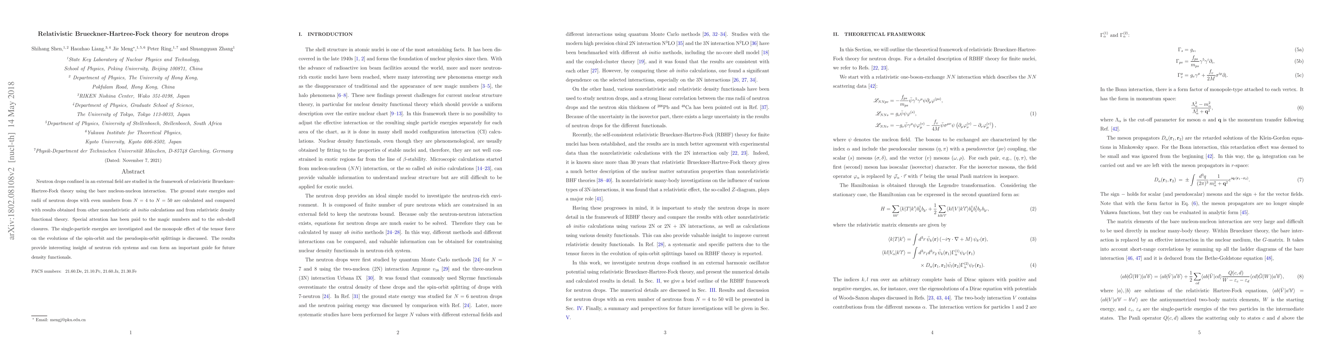 This paper employs relativistic Brueckner-Hartree-Fock theory to study neutron drops, calculating ground state energies and radii for even neutron numbers from 4 to 50. It compares these results with nonrelativistic and relativistic density functional theory, focusing on magic numbers and sub-shell closures, and discusses the monopole effect of the tensor force on spin-orbit and pseudospin-orbit splittings.