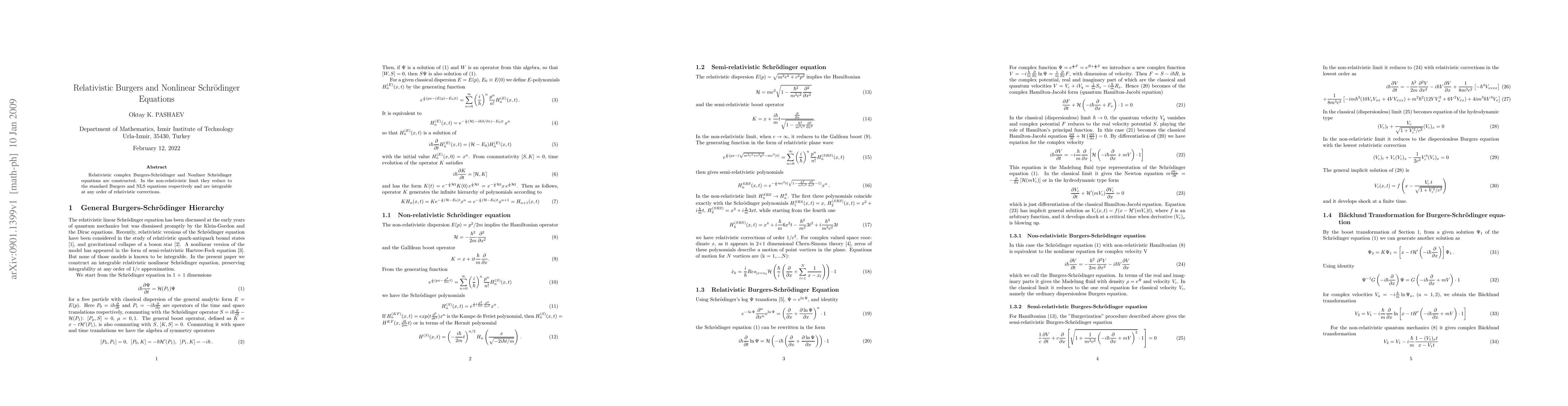 Relativistic complex Burgers-Schr\"odinger and Nonlinear Schr\"odinger equations are constructed. In the non-relativistic limit they reduce to the standard Burgers and NLS equations respectively and are integrable at any order of relativistic corrections.