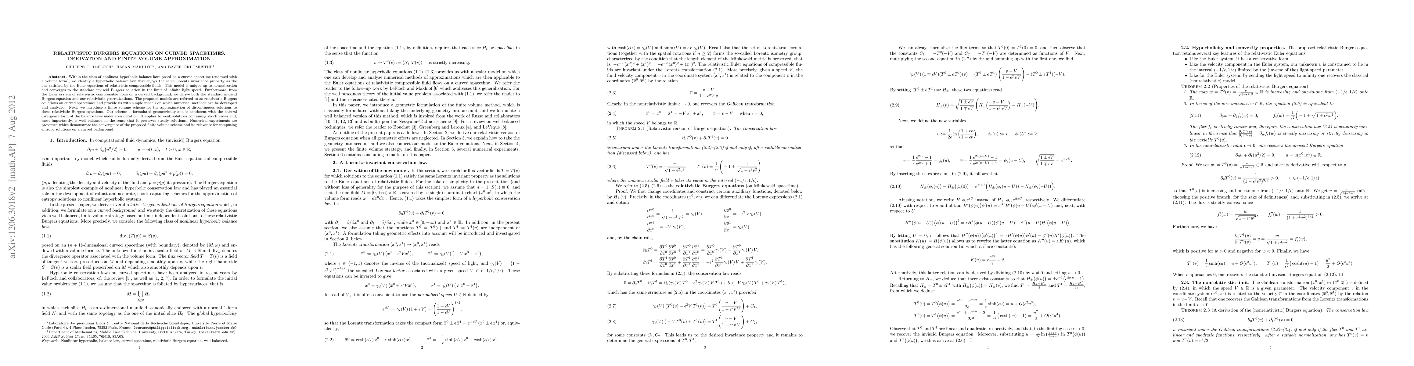 This paper develops relativistic Burgers equations on curved spacetimes, deriving them from the Euler system of relativistic compressible flows. It introduces a finite volume scheme for approximating discontinuous solutions, demonstrating convergence and relevance for computing entropy solutions on curved backgrounds.