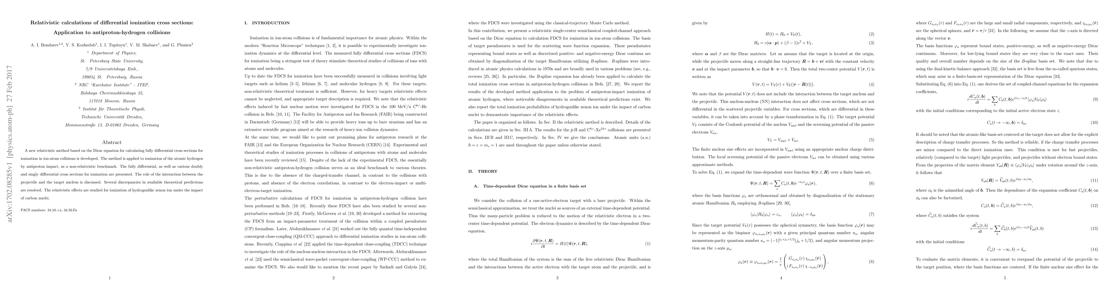 This paper develops a new relativistic method based on the Dirac equation to calculate differential ionization cross sections in ion-atom collisions, applying it to antiproton-hydrogen interactions. The study resolves discrepancies in theoretical predictions and examines relativistic effects in hydrogenlike xenon ion ionization by carbon nuclei.