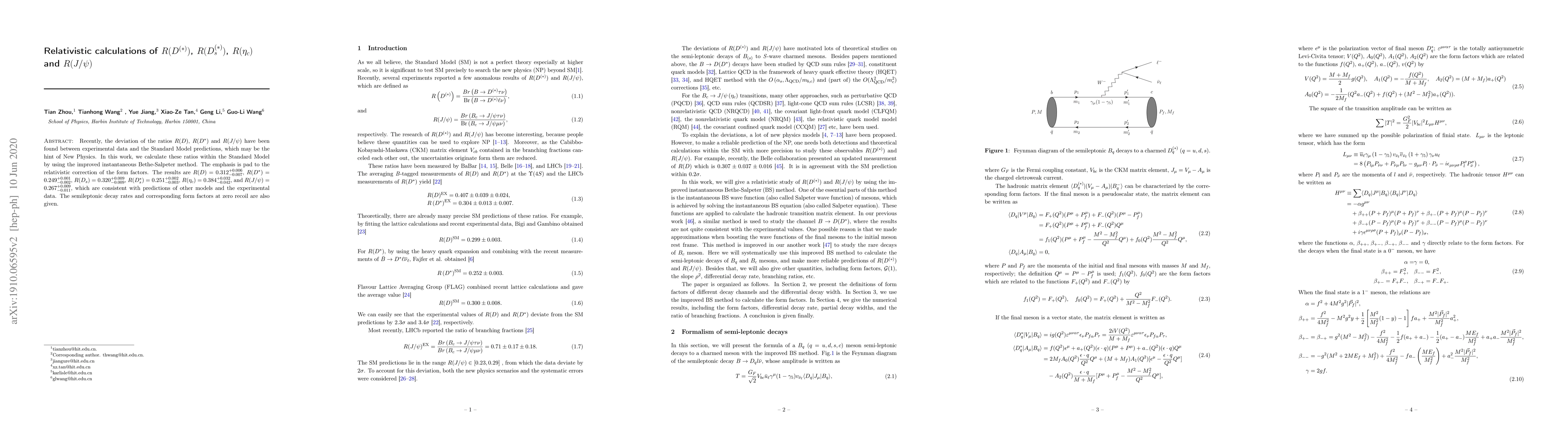 Recently, the deviation of the ratios $R(D)$, $R(D^{*})$ and $R(J/\psi)$ have been found between experimental data and the Standard Model predictions, which may be the hint of New Physics. In this work, we calculate these ratios within the Standard Model by using the improved instantaneous Bethe-Salpeter method. The emphasis is pad to the relativistic correction of the form factors. The results are $R(D)=0.312 ^{+0.006}_{-0.007}$, $R(D^*)= 0.249^{+0.001}_{-0.002}$, $R(D_s)=0.320 ^{+0.009}_{-0.009}$, $R(D^*_s)=0.251 ^{+0.002}_{-0.003}$, $R(\eta_c)=0.384 ^{+0.032}_{-0.042}$, and $R(J/\psi)=0.267 ^{+0.009}_{-0.011}$, which are consistent with predictions of other models and the experimental data. The semileptonic decay rates and corresponding form factors at zero recoil are also given.