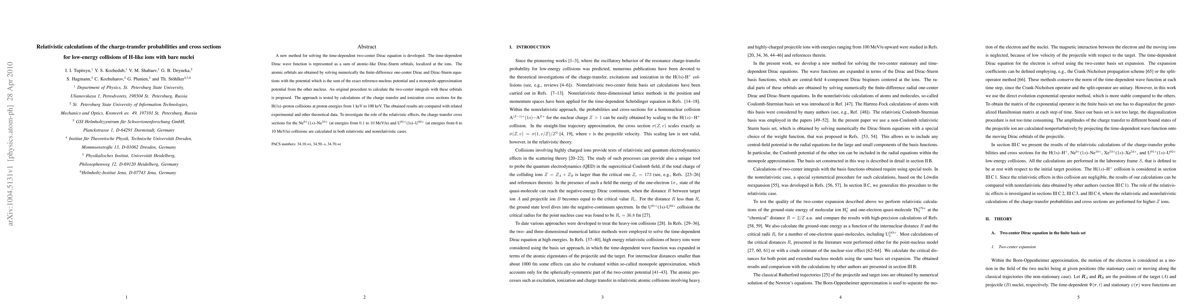 A new method for solving the time-dependent two-center Dirac equation is developed. The time-dependent Dirac wave function is represented as a sum of atomic-like Dirac-Sturm orbitals, localized at the ions. The atomic orbitals are obtained by solving numerically the finite-difference one-center Dirac and Dirac-Sturm equations with the potential which is the sum of the exact reference-nucleus potential and a monopole-approximation potential from the other nucleus. An original procedure to calculate the two-center integrals with these orbitals is proposed. The approach is tested by calculations of the charge transfer and ionization cross sections for the H(1s)--proton collisions at proton energies from 1 keV to 100 keV. The obtained results are compared with related experimental and other theoretical data. To investigate the role of the relativistic effects, the charge transfer cross sections for the Ne^{9+}(1s)--Ne^{10+} (at energies from 0.1 to 10 MeV/u) and U^{91+}(1s)--U^{92+} (at energies from 6 to 10 MeV/u) collisions are calculated in both relativistic and nonrelativistic cases.