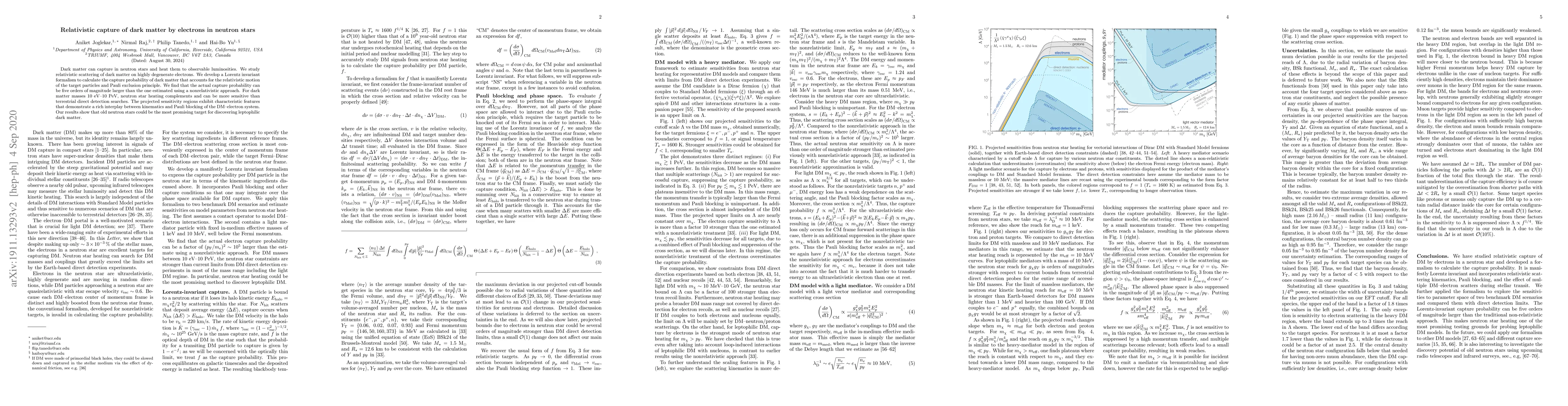 Dark matter can capture in neutron stars and heat them to observable luminosities. We study relativistic scattering of dark matter on highly degenerate electrons. We develop a Lorentz invariant formalism to calculate the capture probability of dark matter that accounts for the relativistic motion of the target particles and Pauli exclusion principle. We find that the actual capture probability can be five orders of magnitude larger than the one estimated using a nonrelativistic approach. For dark matter masses $10~{\rm eV}\textup{--}10~{\rm PeV}$, neutron star heating complements and can be more sensitive than terrestrial direct detection searches. The projected sensitivity regions exhibit characteristic features that demonstrate a rich interplay between kinematics and Pauli blocking of the DM--electron system. Our results show that old neutron stars could be the most promising target for discovering leptophilic dark matter.