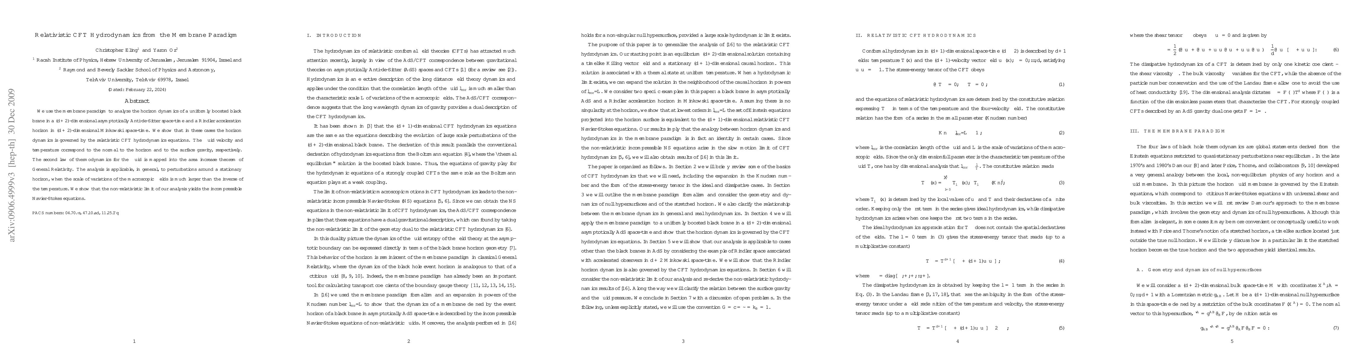 This paper uses the membrane paradigm to demonstrate that horizon dynamics in boosted black branes and Rindler horizons follow relativistic conformal field theory (CFT) hydrodynamics. The analysis connects fluid dynamics to gravitational thermodynamics, showing the area increase theorem in General Relativity corresponds to the second law of thermodynamics for the fluid.