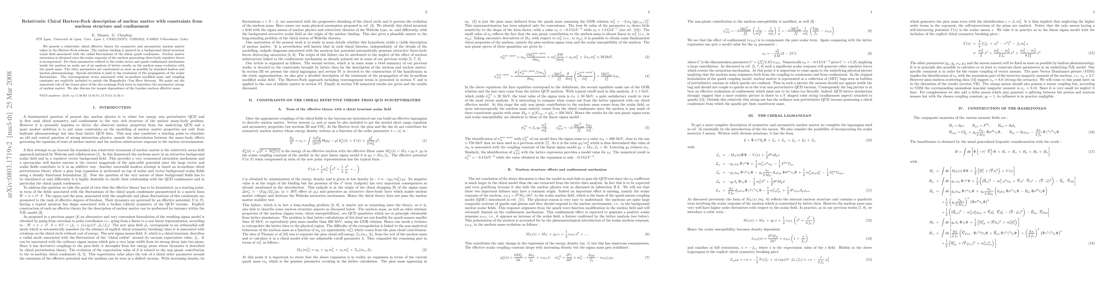 This paper develops a relativistic chiral Hartree-Fock theory for nuclear matter, incorporating nucleon structure and confinement constraints. It emphasizes the role of scalar fluctuations and the rho exchange Fock term to accurately reproduce nuclear matter properties and asymmetry energy.